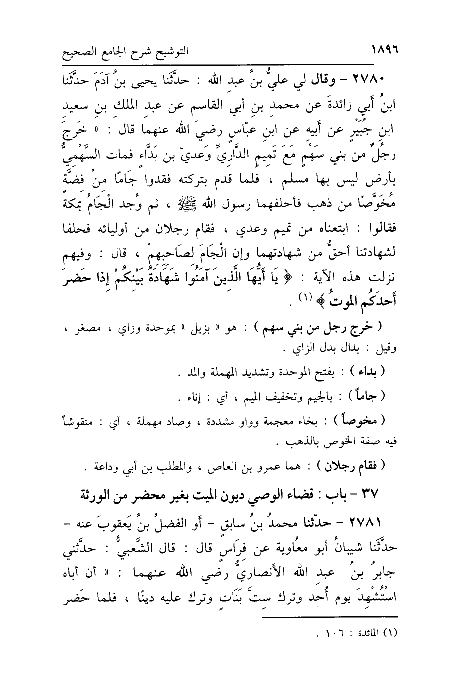 2780 - وَقَالَ لِي عَلِيُّ بْنُ عَبْدِ اللَّهِ: حَدَّثَنَا يَحْيَى بْنُ آدَمَ، حَدَّثَنَا ابْنُ أَبِي زَائِدَةَ، عَنْ مُحَمَّدِ بْنِ أَبِي القَاسِمِ، عَنْ عَبْدِ المَلِكِ بْنِ سَعِيدِ بْنِ جُبَيْرٍ، عَنْ أَبِيهِ، عَنْ ابْنِ عَبَّاسٍ رَضِيَ اللَّهُ عَنْهُمَا، قَالَ: خَرَجَ رَجُلٌ مِنْ بَنِي سَهْمٍ مَعَ تَمِيمٍ الدَّارِيِّ، وَعَدِيِّ بْنِ بَدَّاءٍ، فَمَاتَ السَّهْمِيُّ بِأَرْضٍ لَيْسَ بِهَا مُسْلِمٌ، فَلَمَّا قَدِمَا بِتَرِكَتِهِ، فَقَدُوا جَامًا مِنْ فِضَّةٍ مُخَوَّصًا مِنْ ذَهَبٍ، «فَأَحْلَفَهُمَا رَسُولُ اللَّهِ صلّى الله عليه وسلم»، ثُمَّ وُجِدَ الجَامُ بِمَكَّةَ، فَقَالُوا: ابْتَعْنَاهُ مِنْ تَمِيمٍ وَعَدِيٍّ، فَقَامَ رَجُلاَنِ مِنْ أَوْلِيَائِهِ، فَحَلَفَا لَشَهَادَتُنَا أَحَقُّ مِنْ شَهَادَتِهِمَا، وَإِنَّ الجَامَ لِصَاحِبِهِمْ، قَالَ: وَفِيهِمْ نَزَلَتْ هَذِهِ الآيَةُ: {يَا أَيُّهَا الَّذِينَ آمَنُوا شَهَادَةُ بَيْنِكُمْ إِذَا حَضَرَ أَحَدَكُمُ المَوْتُ} [المائدة: 106].