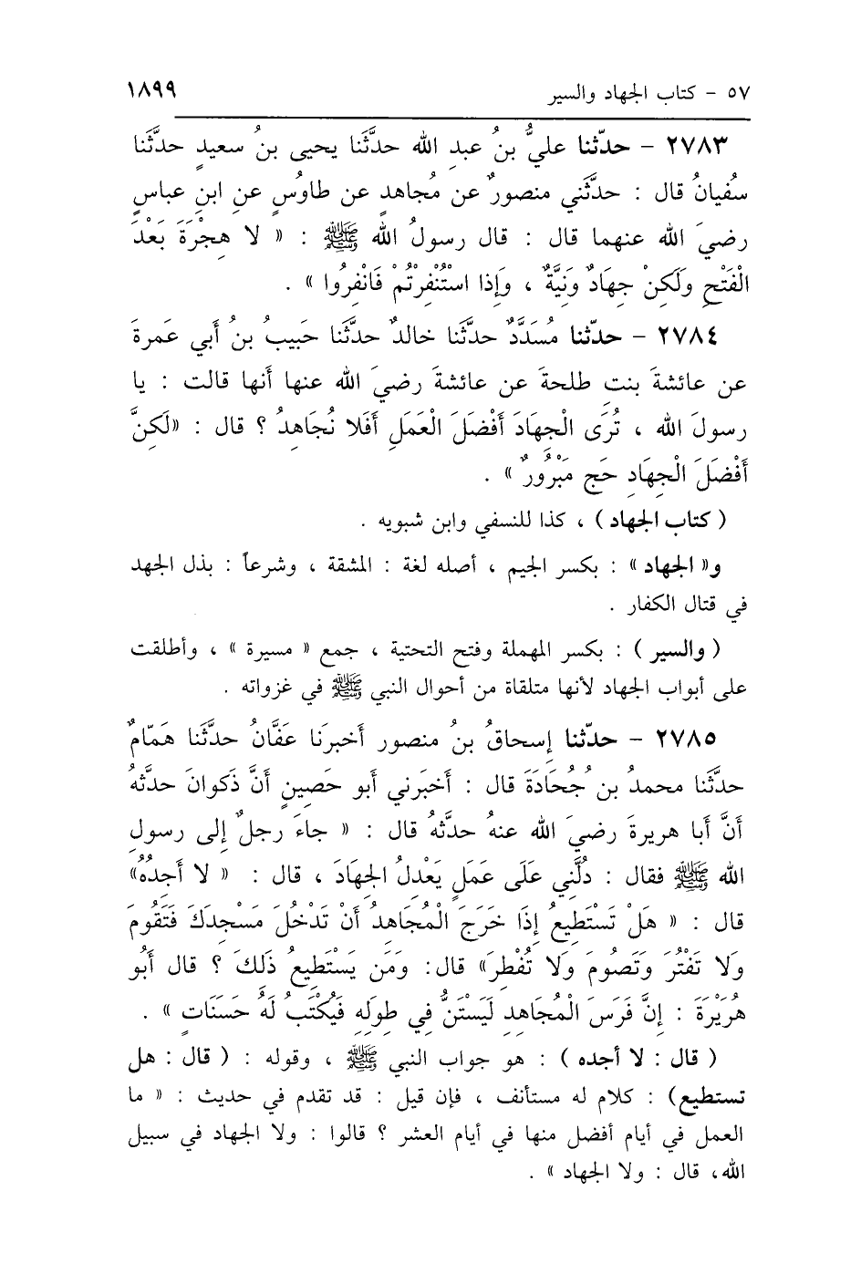 2785 - حَدَّثَنَا إِسْحَاقُ بْنُ مَنْصُورٍ، أَخْبَرَنَا عَفَّانُ، حَدَّثَنَا هَمَّامٌ، حَدَّثَنَا مُحَمَّدُ بْنُ جُحَادَةَ، قَالَ: أَخْبَرَنِي أَبُو حَصِينٍ، أَنَّ ذَكْوَانَ، حَدَّثَهُ أَنَّ أَبَا هُرَيْرَةَ رَضِيَ اللَّهُ عَنْهُ حَدَّثَهُ، قَالَ: جَاءَ رَجُلٌ إِلَى رَسُولِ اللَّهِ صَلَّى اللهُ عَلَيْهِ وَسَلَّمَ، فَقَالَ: دُلَّنِي عَلَى عَمَلٍ يَعْدِلُ الجِهَادَ؟ قَالَ: «لاَ أَجِدُهُ» قَالَ: «هَلْ تَسْتَطِيعُ إِذَا خَرَجَ المُجَاهِدُ أَنْ تَدْخُلَ مَسْجِدَكَ فَتَقُومَ وَلاَ تَفْتُرَ، وَتَصُومَ وَلاَ تُفْطِرَ؟»، قَالَ: وَمَنْ يَسْتَطِيعُ ذَلِكَ؟، قَالَ أَبُو هُرَيْرَةَ: «إِنَّ فَرَسَ المُجَاهِدِ لَيَسْتَنُّ فِي طِوَلِهِ، فَيُكْتَبُ لَهُ حَسَنَاتٍ».