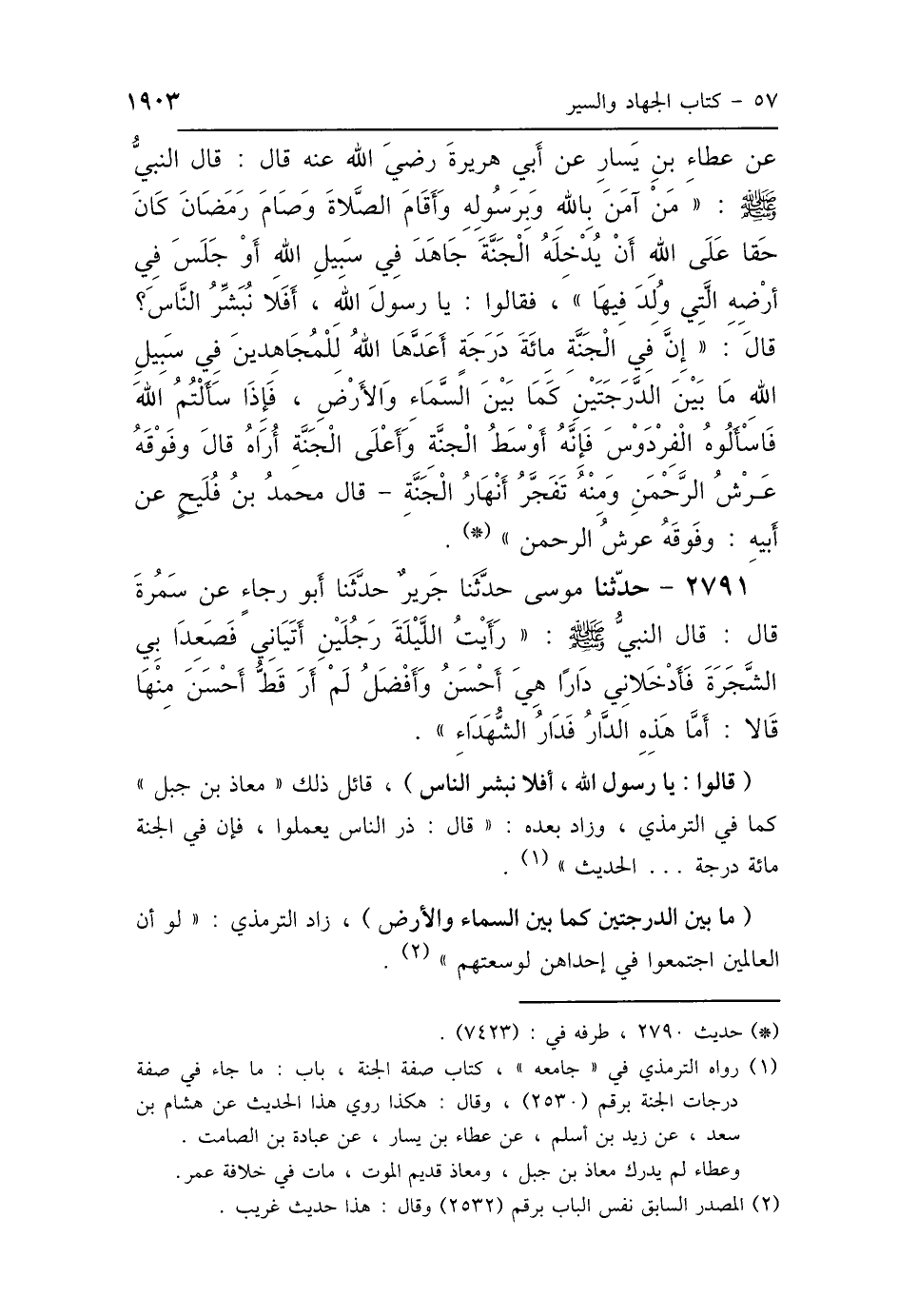 (ما بين الدرجتين كما بين السماء والأرض)، زاد الترمذي: "لو أن العالمين اجتمعوا في إحداهن لوسعتهم".