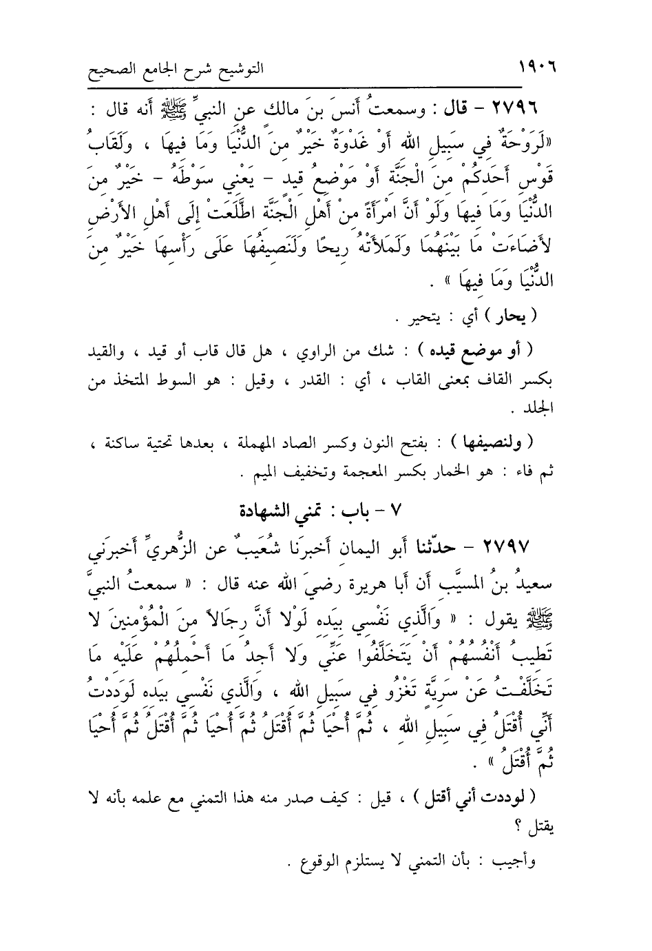 2796 - قَالَ: وَسَمِعْتُ أَنَسَ بْنَ مَالِكٍ، عَنِ النَّبِيِّ صَلَّى اللهُ عَلَيْهِ وَسَلَّمَ: «لَرَوْحَةٌ فِي سَبِيلِ اللَّهِ، أَوْ غَدْوَةٌ، خَيْرٌ مِنَ الدُّنْيَا وَمَا فِيهَا، وَلَقَابُ قَوْسِ أَحَدِكُمْ مِنَ الجَنَّةِ، أَوْ مَوْضِعُ قِيدٍ - يَعْنِي سَوْطَهُ - خَيْرٌ مِنَ الدُّنْيَا وَمَا فِيهَا، وَلَوْ أَنَّ امْرَأَةً مِنْ أَهْلِ الجَنَّةِ اطَّلَعَتْ إِلَى أَهْلِ الأَرْضِ لَأَضَاءَتْ مَا بَيْنَهُمَا، وَلَمَلَأَتْهُ رِيحًا، وَلَنَصِيفُهَا عَلَى رَأْسِهَا خَيْرٌ مِنَ الدُّنْيَا وَمَا فِيهَا».