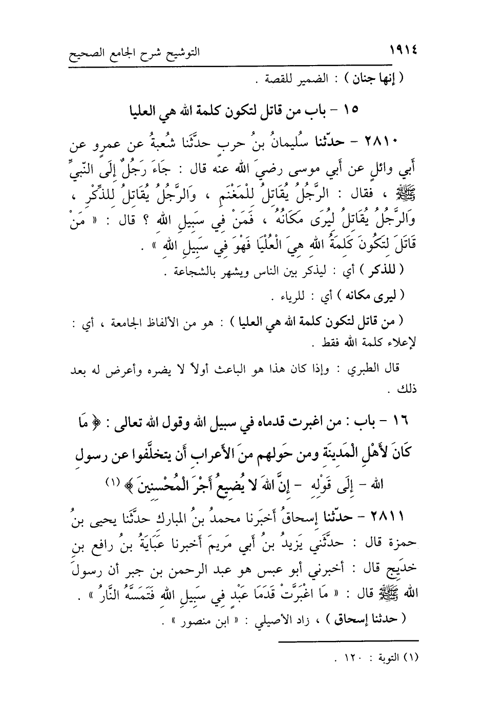 15 - بَابُ مَنْ قَاتَلَ لِتَكُونَ كَلِمَةُ اللَّهِ هِيَ العُلْيَا