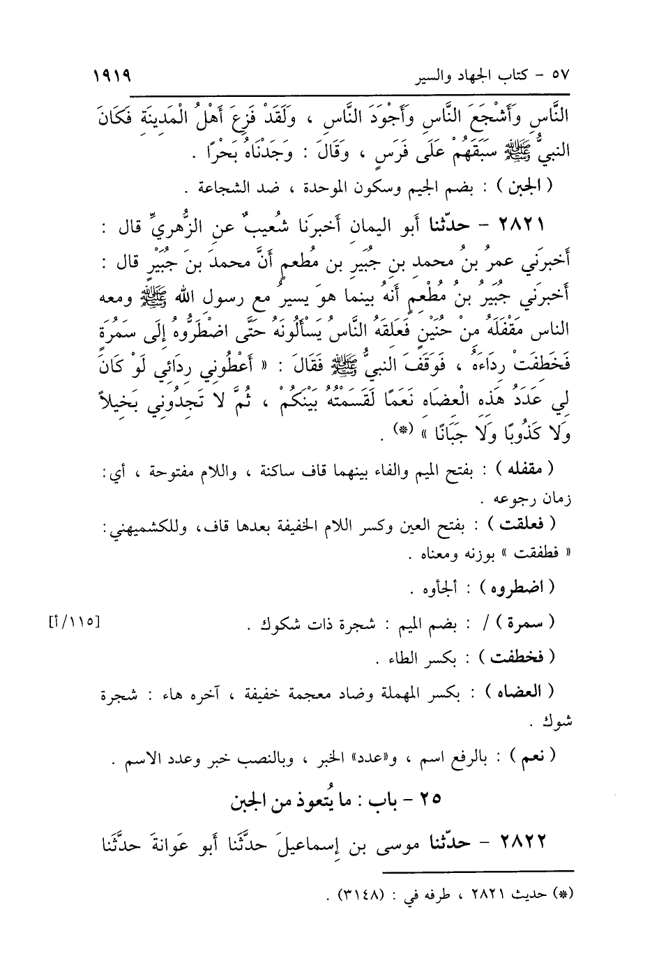 2821 - حَدَّثَنَا أَبُو اليَمَانِ، أَخْبَرَنَا شُعَيْبٌ، عَنِ الزُّهْرِيِّ قَالَ: أَخْبَرَنِي عُمَرُ بْنُ مُحَمَّدِ بْنِ جُبَيْرِ بْنِ مُطْعِمٍ، أَنَّ مُحَمَّدَ بْنَ جُبَيْرٍ، قَالَ: أَخْبَرَنِي جُبَيْرُ بْنُ مُطْعِمٍ: أَنَّهُ بَيْنَمَا هُوَ يَسِيرُ مَعَ رَسُولِ اللَّهِ صَلَّى اللهُ عَلَيْهِ وَسَلَّمَ وَمَعَهُ النَّاسُ مَقْفَلَهُ مِنْ حُنَيْنٍ، فَعَلِقَهُ النَّاسُ يَسْأَلُونَهُ حَتَّى اضْطَرُّوهُ إِلَى سَمُرَةٍ، فَخَطِفَتْ رِدَاءَهُ، فَوَقَفَ النَّبِيُّ صَلَّى اللهُ عَلَيْهِ وَسَلَّمَ، فَقَالَ: «أَعْطُونِي رِدَائِي، لَوْ كَانَ لِي عَدَدُ هَذِهِ العِضَاهِ نَعَمًا لَقَسَمْتُهُ بَيْنَكُمْ، ثُمَّ لاَ تَجِدُونِي بَخِيلًا، وَلاَ كَذُوبًا، وَلاَ جَبَانًا».