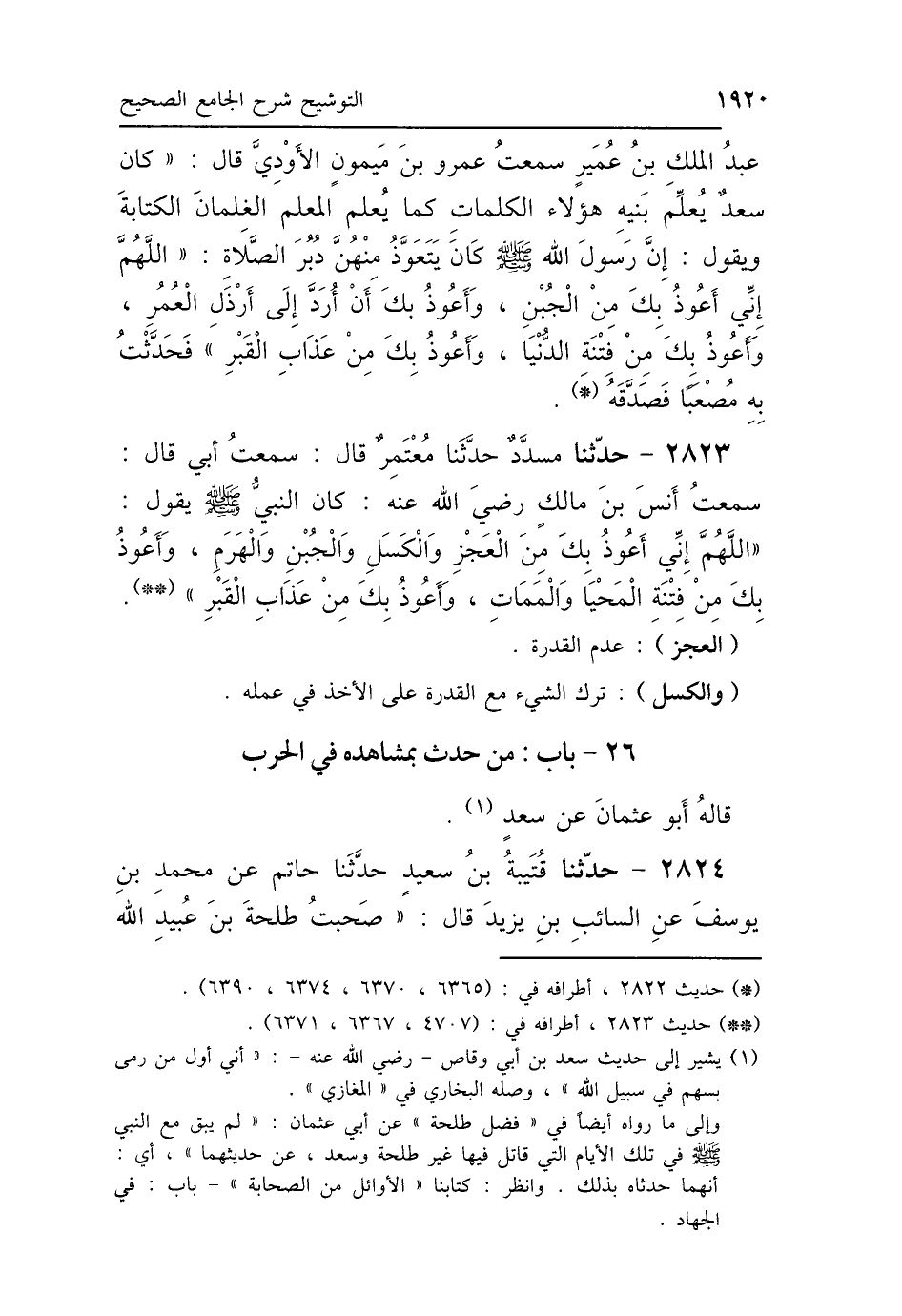 عَبْدُ المَلِكِ بْنُ عُمَيْرٍ، سَمِعْتُ عَمْرَو بْنَ مَيْمُونٍ الأَوْدِيَّ، قَالَ: كَانَ سَعْدٌ يُعَلِّمُ بَنِيهِ هَؤُلاَءِ الكَلِمَاتِ كَمَا يُعَلِّمُ المُعَلِّمُ الغِلْمَانَ الكِتَابَةَ وَيَقُولُ: إِنَّ رَسُولَ اللَّهِ صَلَّى اللهُ عَلَيْهِ وَسَلَّمَ كَانَ يَتَعَوَّذُ مِنْهُنَّ دُبُرَ الصَّلاَةِ: «اللَّهُمَّ إِنِّي أَعُوذُ بِكَ مِنَ الجُبْنِ، وَأَعُوذُ بِكَ أَنْ أُرَدَّ إِلَى أَرْذَلِ العُمُرِ، وَأَعُوذُ بِكَ مِنْ فِتْنَةِ الدُّنْيَا، وَأَعُوذُ بِكَ مِنْ عَذَابِ القَبْرِ»، فَحَدَّثْتُ بِهِ مُصْعَبًا فَصَدَّقَهُ.