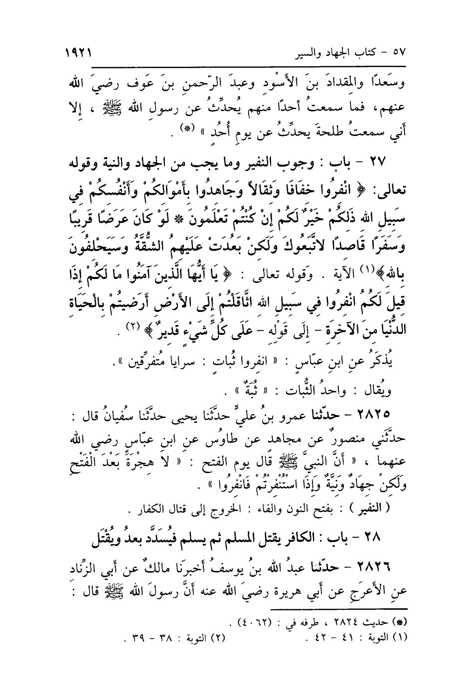 27 - بَابُ وُجُوبِ النَّفِيرِ، وَمَا يَجِبُ مِنَ الجِهَادِ وَالنِّيَّةِ وَقَوْلِ اللَّهِ عَزَّ وَجَلَّ: {انْفِرُوا خِفَافًا وَثِقَالًا، وَجَاهِدُوا بِأَمْوَالِكُمْ وَأَنْفُسِكُمْ فِي سَبِيلِ اللَّهِ ذَلِكُمْ خَيْرٌ لَكُمْ إِنْ كُنْتُمْ تَعْلَمُونَ، لَوْ كَانَ عَرَضًا قَرِيبًا، وَسَفَرًا قَاصِدًا لاَتَّبَعُوكَ، وَلَكِنْ بَعُدَتْ عَلَيْهِمُ الشُّقَّةُ وَسَيَحْلِفُونَ بِاللَّهِ} [التوبة: 42] الآيَةَ وَقَوْلِهِ: {يَا أَيُّهَا الَّذِينَ آمَنُوا مَا لَكُمْ إِذَا قِيلَ لَكُمْ انْفِرُوا فِي سَبِيلِ اللَّهِ اثَّاقَلْتُمْ إِلَى الأَرْضِ، أَرَضِيتُمْ بِالحَيَاةِ الدُّنْيَا مِنَ الآخِرَةِ} [التوبة: 38] إِلَى قَوْلِهِ {عَلَى كُلِّ شَيْءٍ قَدِيرٌ} [البقرة: 20]