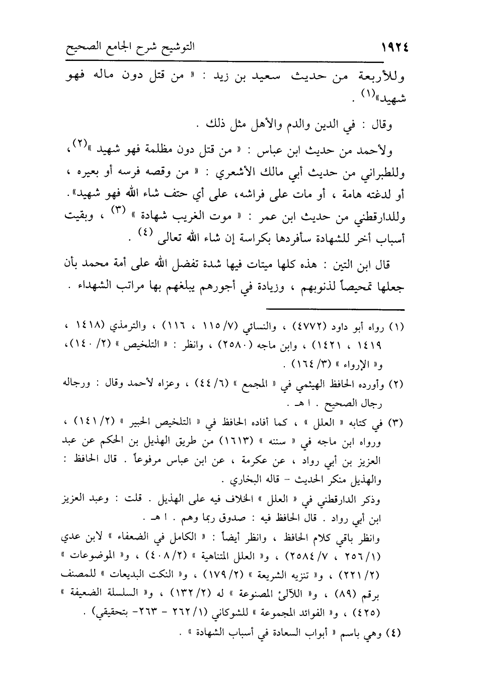 وللدارقطني من حديث ابن عمر: "موت الغريب شهادة"، وبقيت أسباب أخر للشهادة سأفردها بكراسة إن شاء الله تعالى.