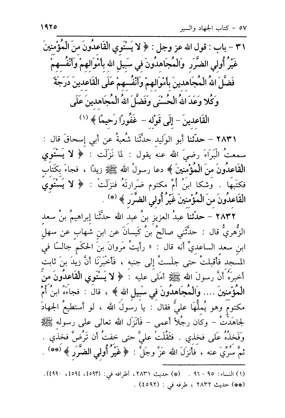 2832 - حَدَّثَنَا عَبْدُ العَزِيزِ بْنُ عَبْدِ اللَّهِ، حَدَّثَنَا إِبْرَاهِيمُ بْنُ سَعْدٍ الزُّهْرِيُّ، قَالَ: حَدَّثَنِي صَالِحُ بْنُ كَيْسَانَ، عَنِ ابْنِ شِهَابٍ، عَنْ سَهْلِ بْنِ سَعْدٍ السَّاعِدِيِّ، أَنَّهُ قَالَ: رَأَيْتُ مَرْوَانَ بْنَ الحَكَمِ جَالِسًا فِي المَسْجِدِ، فَأَقْبَلْتُ حَتَّى جَلَسْتُ إِلَى جَنْبِهِ، فَأَخْبَرَنَا أَنَّ زَيْدَ بْنَ ثَابِتٍ أَخْبَرَهُ: " أَنَّ رَسُولَ اللَّهِ صَلَّى اللهُ عَلَيْهِ وَسَلَّمَ أَمْلَى عَلَيْهِ: {لاَ يَسْتَوِي القَاعِدُونَ مِنَ المُؤْمِنِينَ} [النساء: 95] {وَالمُجَاهِدُونَ فِي سَبِيلِ اللَّهِ} [النساء: 95] "، قَالَ: فَجَاءَهُ ابْنُ أُمِّ مَكْتُومٍ وَهُوَ يُمِلُّهَا عَلَيَّ، فَقَالَ: يَا رَسُولَ اللَّهِ، لَوْ أَسْتَطِيعُ الجِهَادَ لَجَاهَدْتُ - وَكَانَ رَجُلًا أَعْمَى - فَأَنْزَلَ اللَّهُ تَبَارَكَ وَتَعَالَى عَلَى رَسُولِهِ صَلَّى اللهُ عَلَيْهِ وَسَلَّمَ، وَفَخِذُهُ عَلَى فَخِذِي، فَثَقُلَتْ عَلَيَّ حَتَّى خِفْتُ أَنَّ تَرُضَّ فَخِذِي، ثُمَّ سُرِّيَ عَنْهُ، فَأَنْزَلَ اللَّهُ عَزَّ وَجَلَّ: {غَيْرُ أُولِي الضَّرَرِ} [النساء: 95].