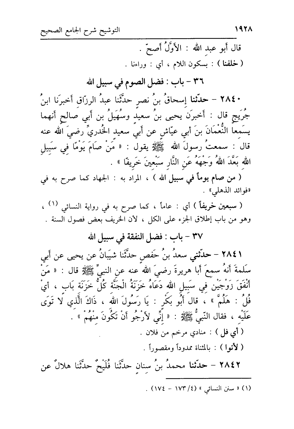 (من صام يومًا في سبيل الله)، المراد به: الجهاد كما صرح به في "فوائد الذهلي".