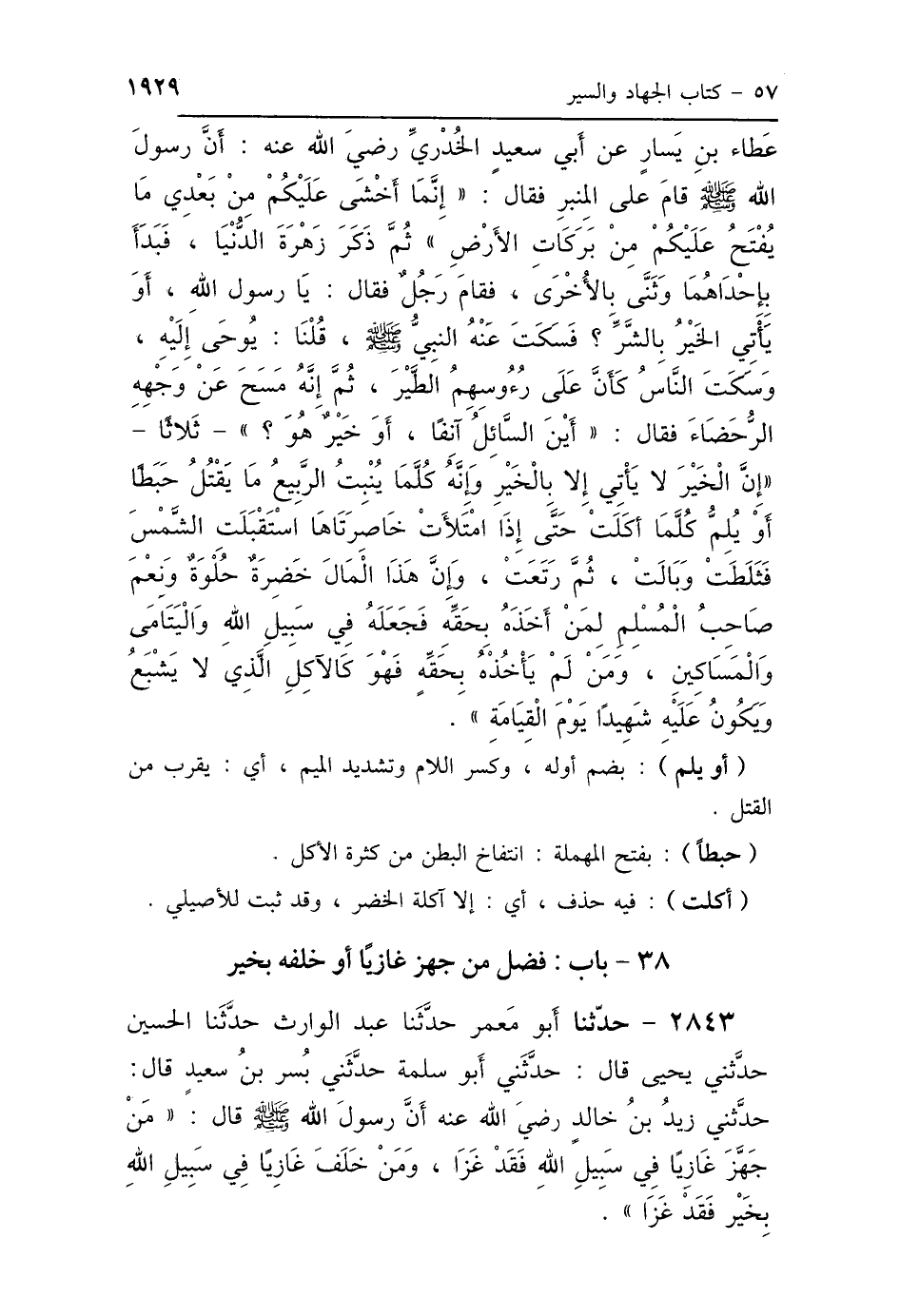 عَطَاءِ بْنِ يَسَارٍ، عَنْ أَبِي سَعِيدٍ الخُدْرِيِّ رَضِيَ اللَّهُ عَنْهُ: أَنَّ رَسُولَ اللَّهِ صَلَّى اللهُ عَلَيْهِ وَسَلَّمَ قَامَ عَلَى المِنْبَرِ، فَقَالَ: «إِنَّمَا أَخْشَى عَلَيْكُمْ مِنْ بَعْدِي مَا يُفْتَحُ عَلَيْكُمْ مِنْ بَرَكَاتِ الأَرْضِ»، ثُمَّ ذَكَرَ زَهْرَةَ الدُّنْيَا، فَبَدَأَ بِإِحْدَاهُمَا، وَثَنَّى بِالأُخْرَى، فَقَامَ رَجُلٌ فَقَالَ: يَا رَسُولَ اللَّهِ، أَوَيَأْتِي الخَيْرُ بِالشَّرِّ؟ فَسَكَتَ عَنْهُ النَّبِيُّ صَلَّى اللهُ عَلَيْهِ وَسَلَّمَ، قُلْنَا: يُوحَى إِلَيْهِ، وَسَكَتَ النَّاسُ كَأَنَّ عَلَى رُءُوسِهِمُ الطَّيْرَ، ثُمَّ إِنَّهُ مَسَحَ عَنْ وَجْهِهِ الرُّحَضَاءَ، فَقَالَ: «أَيْنَ السَّائِلُ آنِفًا، أَوَخَيْرٌ هُوَ - ثَلاَثًا - إِنَّ الخَيْرَ لاَ يَأْتِي إِلَّا بِالخَيْرِ، وَإِنَّهُ كُلَّمَا يُنْبِتُ الرَّبِيعُ مَا يَقْتُلُ حَبَطًا أَوْ يُلِمُّ إِلَّا آكِلَةَ الخَضِرِ، كُلَّمَا أَكَلَتْ حَتَّى إِذَا امْتَلَأَتْ خَاصِرَتَاهَا، اسْتَقْبَلَتِ الشَّمْسَ، فَثَلَطَتْ وَبَالَتْ، ثُمَّ رَتَعَتْ، وَإِنَّ هَذَا المَالَ خَضِرَةٌ حُلْوَةٌ، وَنِعْمَ صَاحِبُ المُسْلِمِ لِمَنْ أَخَذَهُ بِحَقِّهِ، فَجَعَلَهُ فِي سَبِيلِ اللَّهِ، وَاليَتَامَى وَالمَسَاكِينِ وَابْنِ السَّبِيلِ، وَمَنْ لَمْ يَأْخُذْهُ بِحَقِّهِ، فَهُوَ كَالْآكِلِ الَّذِي لاَ يَشْبَعُ، وَيَكُونُ عَلَيْهِ شَهِيدًا يَوْمَ القِيَامَةِ».