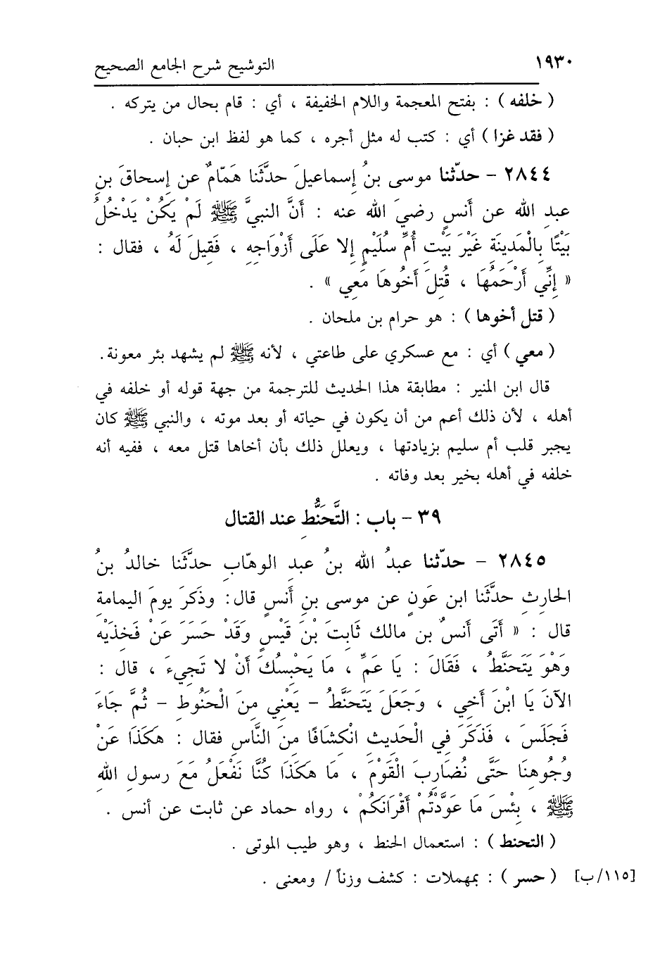 2844 - حَدَّثَنَا مُوسَى بْنُ إِسْمَاعِيلَ، حَدَّثَنَا هَمَّامٌ، عَنْ إِسْحَاقَ بْنِ عَبْدِ اللَّهِ، عَنْ أَنَسٍ رَضِيَ اللَّهُ عَنْهُ: أَنَّ النَّبِيَّ صَلَّى اللهُ عَلَيْهِ وَسَلَّمَ لَمْ يَكُنْ يَدْخُلُ بَيْتًا بِالْمَدِينَةِ غَيْرَ بَيْتِ أُمِّ سُلَيْمٍ إِلَّا عَلَى أَزْوَاجِهِ، فَقِيلَ لَهُ، فَقَالَ: «إِنِّي أَرْحَمُهَا قُتِلَ أَخُوهَا مَعِي».