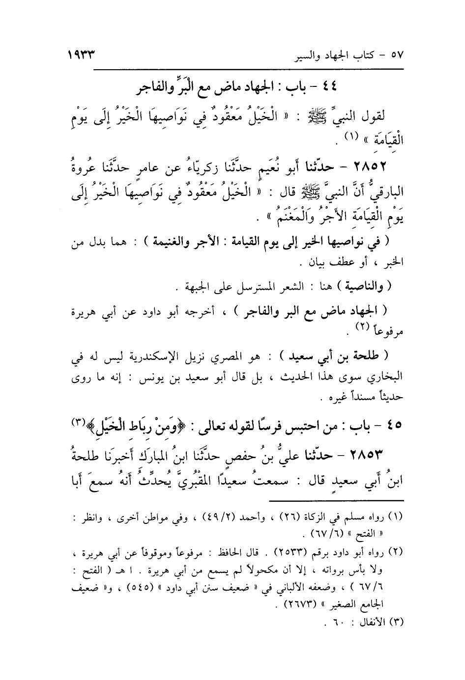 2852 - حَدَّثَنَا أَبُو نُعَيْمٍ، حَدَّثَنَا زَكَرِيَّاءُ، عَنْ عَامِرٍ، حَدَّثَنَا عُرْوَةُ البَارِقِيُّ: أَنَّ النَّبِيَّ صَلَّى اللهُ عَلَيْهِ وَسَلَّمَ قَالَ: "الخَيْلُ مَعْقُودٌ فِي نَوَاصِيهَا الخَيْرُ إِلَى يَوْمِ القِيَامَةِ: الأَجْرُ وَالمَغْنَمُ".