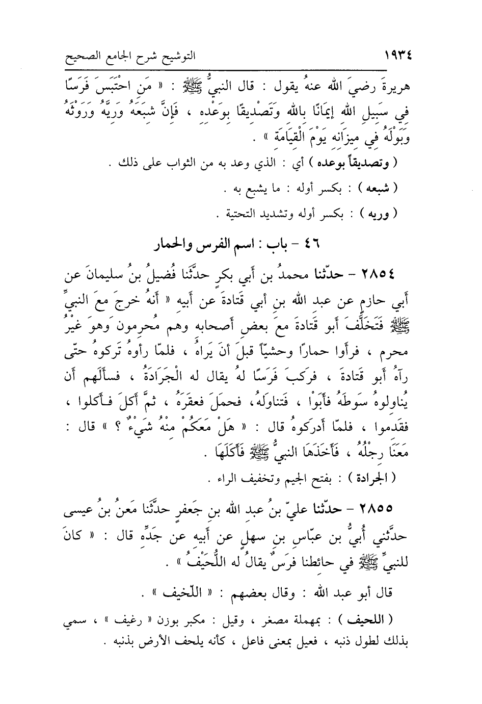 2855 - حَدَّثَنَا عَلِيُّ بْنُ عَبْدِ اللَّهِ بْنِ جَعْفَرٍ، حَدَّثَنَا مَعْنُ بْنُ عِيسَى، حَدَّثَنَا أُبَيُّ بْنُ عَبَّاسِ بْنِ سَهْلٍ، عَنْ أَبِيهِ، عَنْ جَدِّهِ، قَالَ: «كَانَ لِلنَّبِيِّ صَلَّى اللهُ عَلَيْهِ وَسَلَّمَ فِي حَائِطِنَا فَرَسٌ يُقَالُ لَهُ اللُّحَيْفُ»، قَالَ أَبُو عَبْدِ اللَّهِ: "وَقَالَ بَعْضُهُمُ: اللُّخَيْفُ".