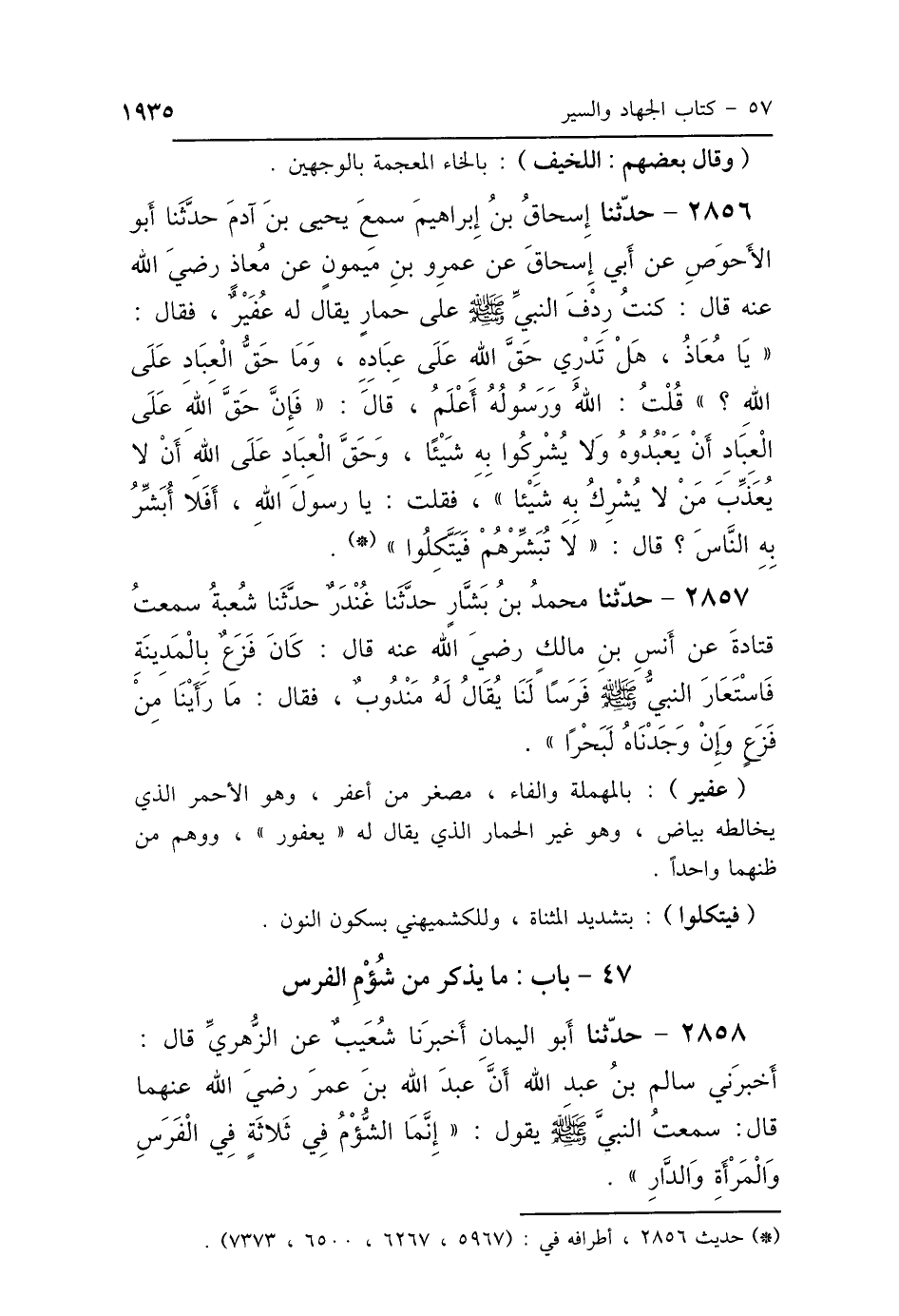 2856 - حَدَّثَنِي إِسْحَاقُ بْنُ إِبْرَاهِيمَ، سَمِعَ يَحْيَى بْنَ آدَمَ، حَدَّثَنَا أَبُو الأَحْوَصِ، عَنْ أَبِي إِسْحَاقَ، عَنْ عَمْرِو بْنِ مَيْمُونٍ، عَنْ مُعَاذٍ رَضِيَ اللَّهُ عَنْهُ، قَالَ: كُنْتُ رِدْفَ النَّبِيِّ صَلَّى اللهُ عَلَيْهِ وَسَلَّمَ عَلَى حِمَارٍ يُقَالُ لَهُ عُفَيْرٌ، فَقَالَ: «يَا مُعَاذُ، هَلْ تَدْرِي حَقَّ اللَّهِ عَلَى عِبَادِهِ، وَمَا حَقُّ العِبَادِ عَلَى اللَّهِ؟»، قُلْتُ: اللَّهُ وَرَسُولُهُ أَعْلَمُ، قَالَ: «فَإِنَّ حَقَّ اللَّهِ عَلَى العِبَادِ أَنْ يَعْبُدُوهُ وَلاَ يُشْرِكُوا بِهِ شَيْئًا، وَحَقَّ العِبَادِ عَلَى اللَّهِ أَنْ لاَ يُعَذِّبَ مَنْ لاَ يُشْرِكُ بِهِ شَيْئًا»، فَقُلْتُ: يَا رَسُولَ اللَّهِ أَفَلاَ أُبَشِّرُ بِهِ النَّاسَ؟ قَالَ: «لاَ تُبَشِّرْهُمْ، فَيَتَّكِلُوا».