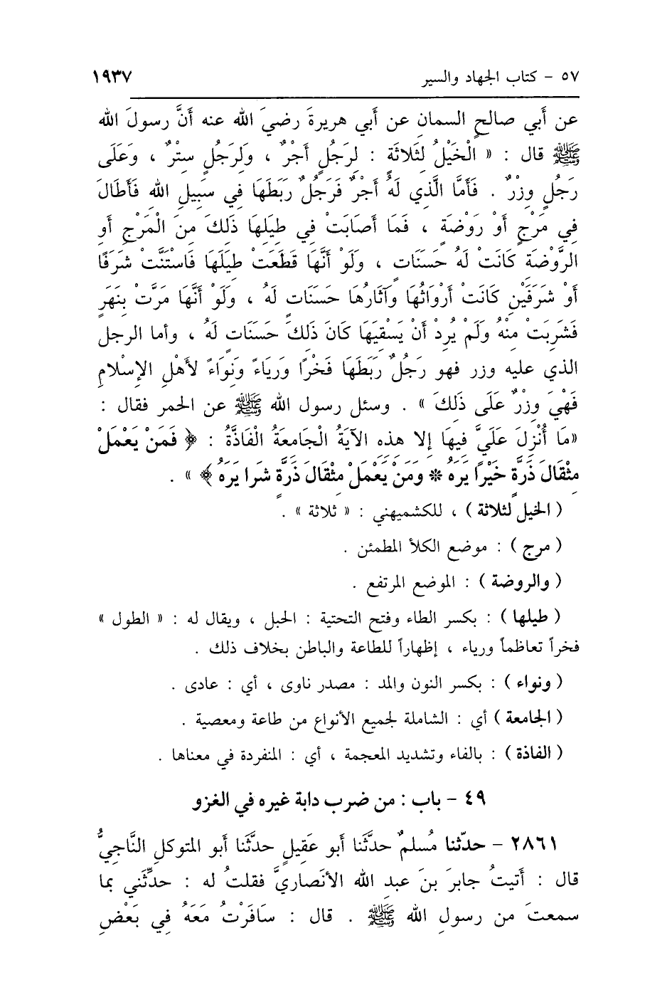 عَنْ أَبِي صَالِحٍ السَّمَّانِ، عَنْ أَبِي هُرَيْرَةَ رَضِيَ اللَّهُ عَنْهُ: أَنَّ رَسُولَ اللَّهِ صَلَّى اللهُ عَلَيْهِ وَسَلَّمَ قَالَ: " الخَيْلُ لِثَلاَثَةٍ: لِرَجُلٍ أَجْرٌ، وَلِرَجُلٍ سِتْرٌ، وَعَلَى رَجُلٍ وِزْرٌ، فَأَمَّا الَّذِي لَهُ أَجْرٌ: فَرَجُلٌ رَبَطَهَا فِي سَبِيلِ اللَّهِ، فَأَطَالَ فِي مَرْجٍ أَوْ رَوْضَةٍ، فَمَا أَصَابَتْ فِي طِيَلِهَا ذَلِكَ مِنَ المَرْجِ أَوِ الرَّوْضَةِ كَانَتْ لَهُ حَسَنَاتٍ، وَلَوْ أَنَّهَا قَطَعَتْ طِيَلَهَا فَاسْتَنَّتْ شَرَفًا أَوْ شَرَفَيْنِ كَانَتْ أَرْوَاثُهَا وَآثَارُهَا حَسَنَاتٍ لَهُ، وَلَوْ أَنَّهَا مَرَّتْ بِنَهَرٍ، فَشَرِبَتْ مِنْهُ وَلَمْ يُرِدْ أَنْ يَسْقِيَهَا كَانَ ذَلِكَ حَسَنَاتٍ لَهُ، وَرَجُلٌ رَبَطَهَا فَخْرًا وَرِئَاءً، وَنِوَاءً لِأَهْلِ الإِسْلاَمِ فَهِيَ وِزْرٌ عَلَى ذَلِكَ "وَسُئِلَ رَسُولُ اللَّهِ صَلَّى اللهُ عَلَيْهِ وَسَلَّمَ عَنْ الحُمُرِ، فَقَالَ: «مَا أُنْزِلَ عَلَيَّ فِيهَا إِلَّا هَذِهِ الآيَةُ الجَامِعَةُ الفَاذَّةُ»: {فَمَنْ يَعْمَلْ مِثْقَالَ ذَرَّةٍ خَيْرًا يَرَهُ، وَمَنْ يَعْمَلْ مِثْقَالَ ذَرَّةٍ شَرًّا يَرَهُ} [الزلزلة: 8].