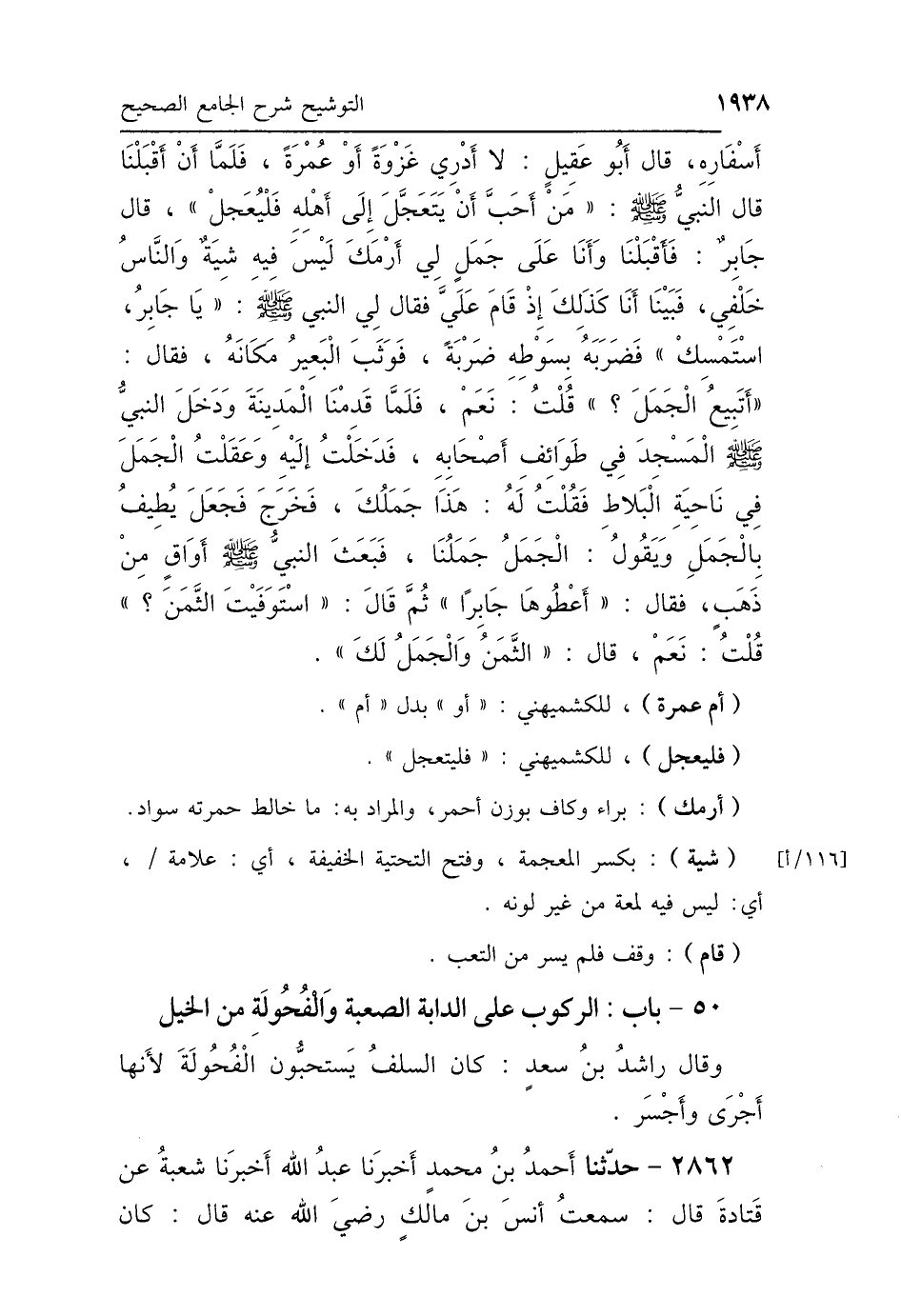 أَسْفَارِهِ - قَالَ أَبُو عَقِيلٍ: لاَ أَدْرِي غَزْوَةً أَوْ عُمْرَةً - فَلَمَّا أَنْ أَقْبَلْنَا قَالَ النَّبِيُّ صَلَّى اللهُ عَلَيْهِ وَسَلَّمَ: «مَنْ أَحَبَّ أَنْ يَتَعَجَّلَ إِلَى أَهْلِهِ فَلْيُعَجِّلْ»، قَالَ جَابِرٌ: فَأَقْبَلْنَا وَأَنَا عَلَى جَمَلٍ لِي أَرْمَكَ لَيْسَ فِيهِ شِيَةٌ، وَالنَّاسُ خَلْفِي، فَبَيْنَا أَنَا كَذَلِكَ إِذْ قَامَ عَلَيَّ، فَقَالَ لِي النَّبِيُّ صَلَّى اللهُ عَلَيْهِ وَسَلَّمَ: «يَا جَابِرُ اسْتَمْسِكْ»، فَضَرَبَهُ بِسَوْطِهِ ضَرْبَةً، فَوَثَبَ البَعِيرُ مَكَانَهُ، فَقَالَ: «أَتَبِيعُ الجَمَلَ؟»، قُلْتُ: نَعَمْ، فَلَمَّا قَدِمْنَا المَدِينَةَ وَدَخَلَ النَّبِيُّ صَلَّى اللهُ عَلَيْهِ وَسَلَّمَ المَسْجِدَ فِي طَوَائِفِ أَصْحَابِهِ، فَدَخَلْتُ إِلَيْهِ وَعَقَلْتُ الجَمَلَ فِي نَاحِيَةِ البَلاَطِ، فَقُلْتُ لَهُ: هَذَا جَمَلُكَ، فَخَرَجَ، فَجَعَلَ يُطِيفُ بِالْجَمَلِ وَيَقُولُ: «الجَمَلُ جَمَلُنَا»، فَبَعَثَ النَّبِيُّ صَلَّى اللهُ عَلَيْهِ وَسَلَّمَ أَوَاقٍ مِنْ ذَهَبٍ، فَقَالَ: «أَعْطُوهَا جَابِرًا» ثُمَّ قَالَ: «اسْتَوْفَيْتَ الثَّمَنَ؟» قُلْتُ: نَعَمْ، قَالَ: «الثَّمَنُ وَالجَمَلُ لَكَ».