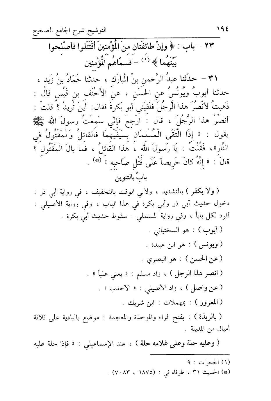 31 - حَدَّثَنَا عَبْدُ الرَّحْمَنِ بْنُ المُبَارَكِ، حَدَّثَنَا حَمَّادُ بْنُ زَيْدٍ، حَدَّثَنَا أَيُّوبُ، وَيُونُسُ، عَنِ الحَسَنِ، عَنِ الأَحْنَفِ بْنِ قَيْسٍ، قَالَ: ذَهَبْتُ لِأَنْصُرَ هَذَا الرَّجُلَ، فَلَقِيَنِي أَبُو بَكْرَةَ فَقَالَ أَيْنَ تُرِيدُ؟ قُلْتُ: أَنْصُرُ هَذَا الرَّجُلَ، قَالَ: ارْجِعْ فَإِنِّي سَمِعْتُ رَسُولَ اللَّهِ صَلَّى اللهُ عَلَيْهِ وَسَلَّمَ يَقُولُ: «إِذَا التَقَى المُسْلِمَانِ بِسَيْفَيْهِمَا فَالقَاتِلُ وَالمَقْتُولُ فِي النَّارِ»، فَقُلْتُ يَا رَسُولَ اللَّهِ هَذَا القَاتِلُ فَمَا بَالُ المَقْتُولِ قَالَ: «إِنَّهُ كَانَ حَرِيصًا عَلَى قَتْلِ صَاحِبِهِ».