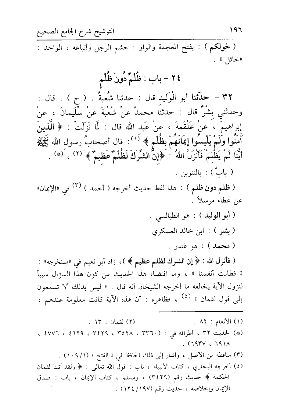32 - حَدَّثَنَا أَبُو الوَلِيدِ، قَالَ: حَدَّثَنَا شُعْبَةُ، ح قَالَ: وحَدَّثَنِي بِشْرُ بْنُ خَالِدٍ أَبُو مُحَمَّدٍ العَسْكَرِيُّ، قَالَ: حَدَّثَنَا مُحَمَّدُ بْنُ جَعْفَرٍ، عَنْ شُعْبَةَ، عَنْ سُلَيْمَانَ، عَنْ إِبْرَاهِيمَ، عَنْ عَلْقَمَةَ، عَنْ عَبْدِ اللَّهِ، قَالَ: لَمَّا نَزَلَتْ: {الَّذِينَ آمَنُوا وَلَمْ يَلْبِسُوا} [الأنعام: 82] إِيمَانَهُمْ بِظُلْمٍ قَالَ أَصْحَابُ رَسُولِ اللَّهِ صَلَّى اللهُ عَلَيْهِ وَسَلَّمَ: أَيُّنَا لَمْ يَظْلِمْ؟ فَأَنْزَلَ اللَّهُ عَزَّ وَجَلَّ: {إِنَّ الشِّرْكَ لَظُلْمٌ عَظِيمٌ} [لقمان: 13].