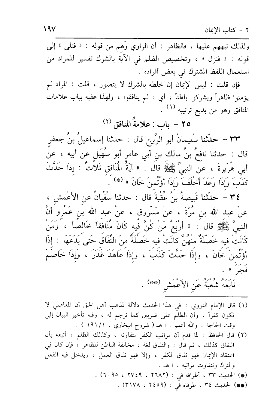 34 - حَدَّثَنَا قَبِيصَةُ بْنُ عُقْبَةَ، قَالَ: حَدَّثَنَا سُفْيَانُ، عَنِ الأَعْمَشِ، عَنْ عَبْدِ اللَّهِ بْنِ مُرَّةَ، عَنْ مَسْرُوقٍ، عَنْ عَبْدِ اللَّهِ بْنِ عَمْرٍو أَنَّ النَّبِيَّ صَلَّى اللهُ عَلَيْهِ وَسَلَّمَ قَالَ: " أَرْبَعٌ مَنْ كُنَّ فِيهِ كَانَ مُنَافِقًا خَالِصًا، وَمَنْ كَانَتْ فِيهِ خَصْلَةٌ مِنْهُنَّ كَانَتْ فِيهِ خَصْلَةٌ مِنَ النِّفَاقِ حَتَّى يَدَعَهَا: إِذَا اؤْتُمِنَ خَانَ، وَإِذَا حَدَّثَ كَذَبَ، وَإِذَا عَاهَدَ غَدَرَ، وَإِذَا خَاصَمَ فَجَرَ " تَابَعَهُ شُعْبَةُ، عَنِ الأَعْمَشِ.