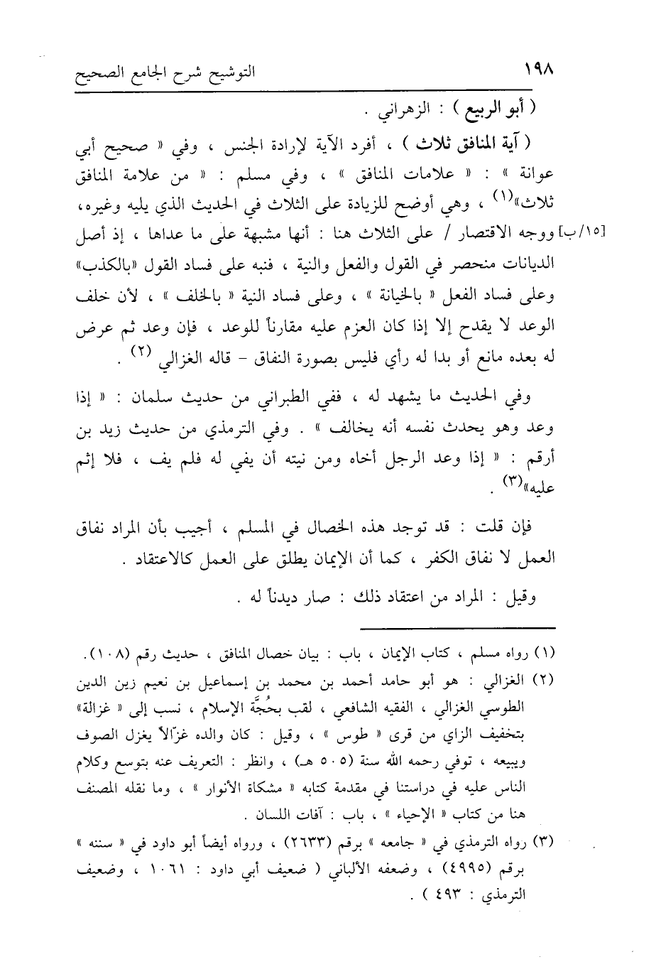 (آية المنافق ثلاث)، أفرد الآية لإرادة الجنس، وفي "صحيح أبي عوانة": "علامات المنافق"، وفي مسلم: "من علامة المنافق ثلاث"، وهي أوضح للزيادة على الثلاث في الحديث الذي يليه وغيره، ووجه الاقتصار على الثلاث هنا: أنها مشبهة على ما عداها، إذ أصل الديانات منحصر في القول والفعل والنية، فنبه على فساد القول "بالكذب" وعلى فساد الفعل "بالخيانة"، وعلى فساد النية "بالخلف"، لأن خلف الوعد لا يقدح إلا إذا كان العزم عليه مقارنًا للوعد، فإن وعد ثم عرض له بعده مانع أو بدا له رأي فليس بصورة النفاق- قاله الغزالي.