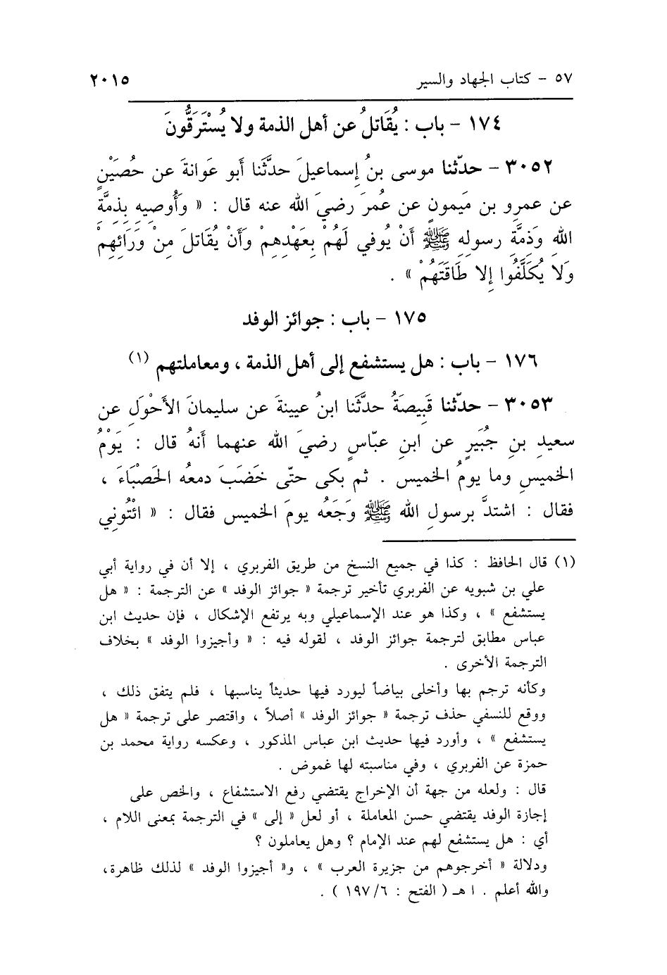 3052 - حَدَّثَنَا مُوسَى بْنُ إِسْمَاعِيلَ، حَدَّثَنَا أَبُو عَوَانَةَ، عَنْ حُصَيْنٍ، عَنْ عَمْرِو بْنِ مَيْمُونٍ، عَنْ عُمَرَ رَضِيَ اللَّهُ عَنْهُ، قَالَ: «وَأُوصِيهِ بِذِمَّةِ اللَّهِ، وَذِمَّةِ رَسُولِهِ صَلَّى اللهُ عَلَيْهِ وَسَلَّمَ، أَنْ يُوفَى لَهُمْ بِعَهْدِهِمْ، وَأَنْ يُقَاتَلَ مِنْ وَرَائِهِمْ، وَلاَ يُكَلَّفُوا إِلَّا طَاقَتَهُمْ».