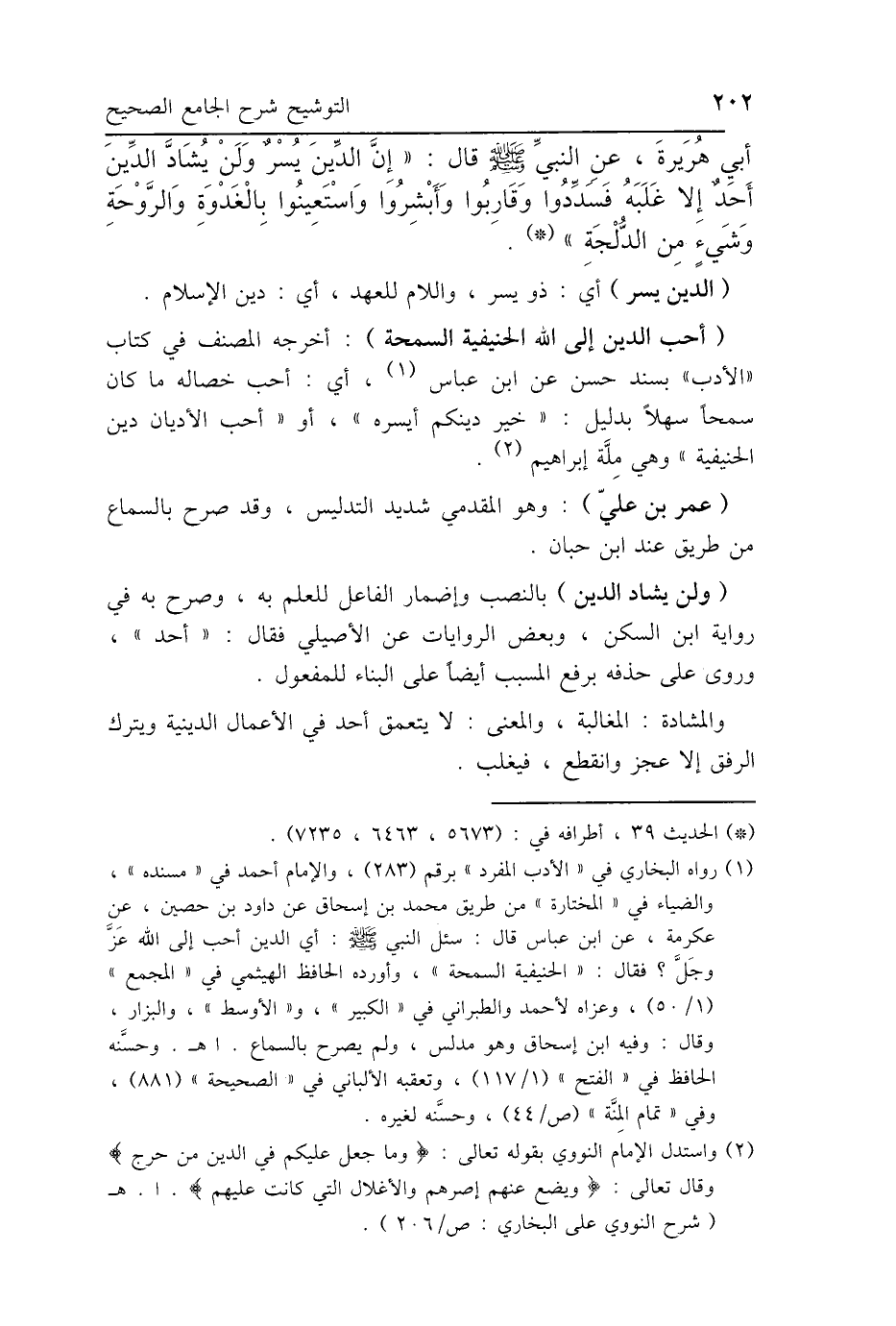 (ولن يشاد الدين) بالنصب وإضمار الفاعل للعلم به، وصرح به في رواية ابن السكن، وبعض الروايات عن الأصيلي فقال: "أحد"، وروى على حذفه برفع المسبب أيضًا على البناء للمفعول.