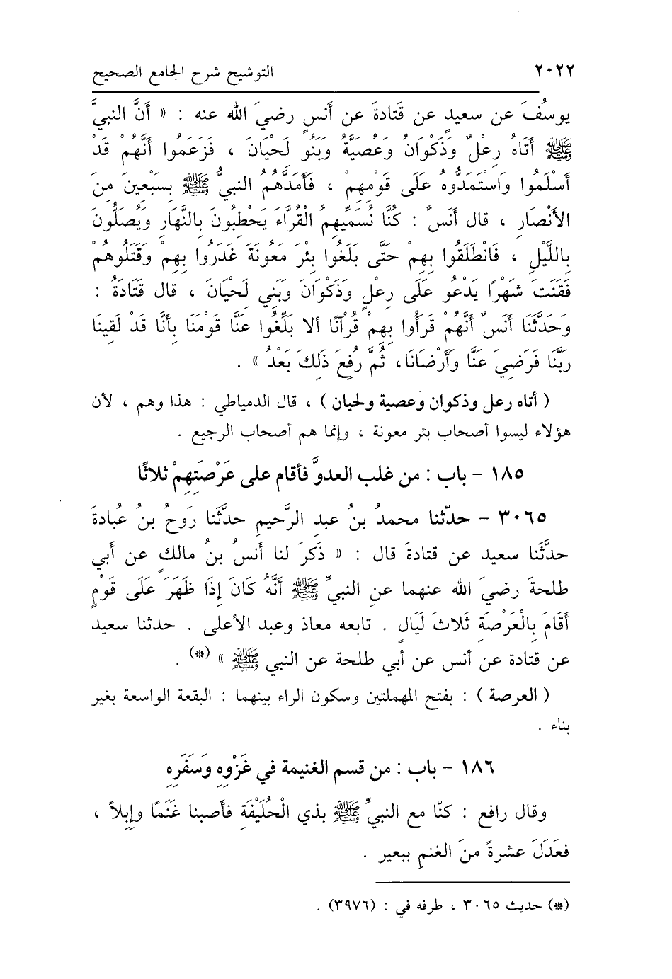(أتاه رعل وذكوان وعصية ولحيان)، قال الدمياطي: هذا وهم، لأن هؤلاء ليسوا أصحاب بئر معونة، وإنما هم أصحاب الرجيع.
