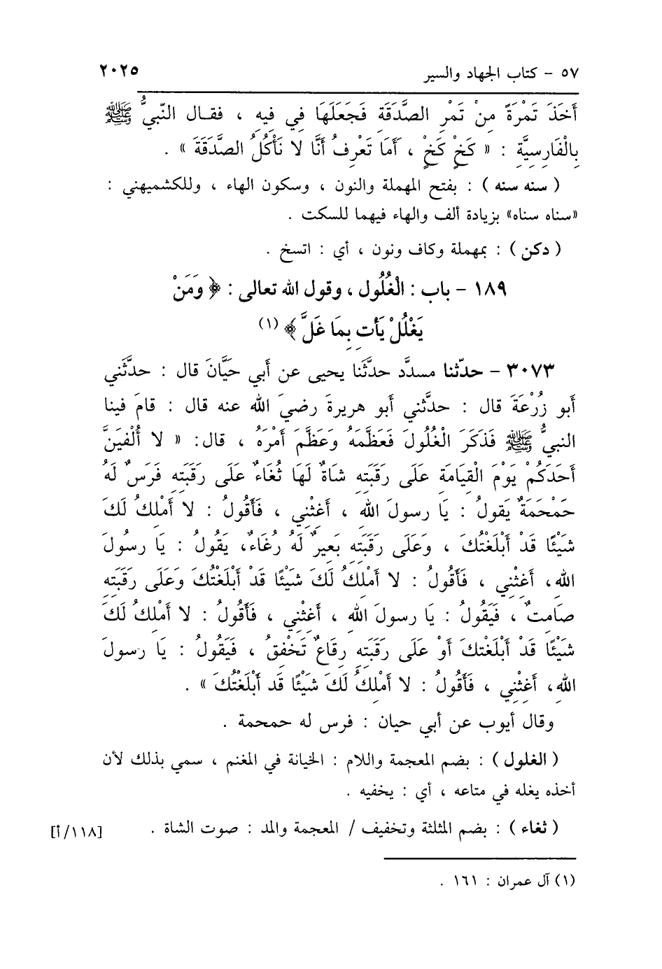 189 - بَابُ الغُلُولِ، وَقَوْلِ اللَّهِ تَعَالَى: {وَمَنْ يَغْلُلْ يَأْتِ بِمَا غَلَّ} [آل عمران: 161]