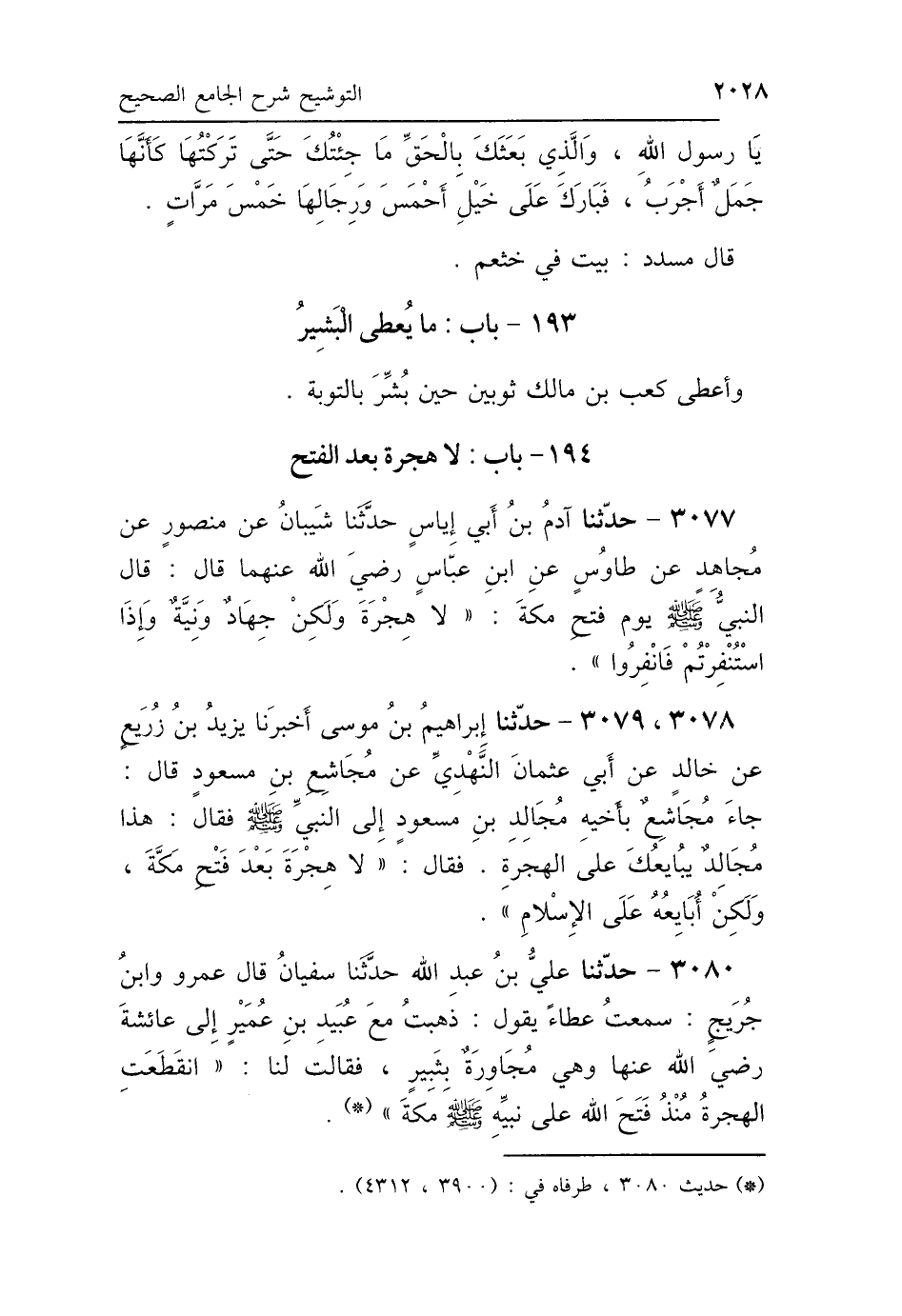 3078، 3079 - حَدَّثَنَا إِبْرَاهِيمُ بْنُ مُوسَى، أَخْبَرَنَا يَزِيدُ بْنُ زُرَيْعٍ، عَنْ خَالِدٍ، عَنْ أَبِي عُثْمَانَ النَّهْدِيِّ، عَنْ مُجَاشِعِ بْنِ مَسْعُودٍ، قَالَ: جَاءَ مُجَاشِعٌ بِأَخِيهِ مُجَالِدِ بْنِ مَسْعُودٍ، إِلَى النَّبِيِّ صَلَّى اللهُ عَلَيْهِ وَسَلَّمَ، فَقَالَ: هَذَا مُجَالِدٌ يُبَايِعُكَ عَلَى الهِجْرَةِ، فَقَالَ: «لاَ هِجْرَةَ بَعْدَ فَتْحِ مَكَّةَ، وَلَكِنْ أُبَايِعُهُ عَلَى الإِسْلاَمِ».
