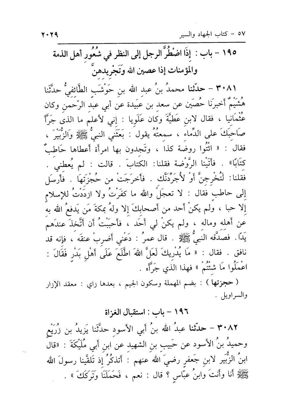 3081 - حَدَّثَنِي مُحَمَّدُ بْنُ عَبْدِ اللَّهِ بْنِ حَوْشَبٍ الطَّائِفِيُّ، حَدَّثَنَا هُشَيْمٌ، أَخْبَرَنَا حُصَيْنٌ، عَنْ سَعْدِ بْنِ عُبَيْدَةَ، عَنْ أَبِي عَبْدِ الرَّحْمَنِ، - وَكَانَ عُثْمَانِيًّا فَقَالَ لِابْنِ عَطِيَّةَ: وَكَانَ عَلَوِيًّا - إِنِّي لَأَعْلَمُ مَا الَّذِي جَرَّأَ صَاحِبَكَ عَلَى الدِّمَاءِ، سَمِعْتُهُ يَقُولُ: بَعَثَنِي النَّبِيُّ صَلَّى اللهُ عَلَيْهِ وَسَلَّمَ وَالزُّبَيْرَ، فَقَالَ: «ائْتُوا رَوْضَةَ كَذَا، وَتَجِدُونَ بِهَا امْرَأَةً، أَعْطَاهَا حَاطِبٌ كِتَابًا»، فَأَتَيْنَا الرَّوْضَةَ: فَقُلْنَا: الكِتَابَ، قَالَتْ: لَمْ يُعْطِنِي، فَقُلْنَا: لَتُخْرِجِنَّ أَوْ لَأُجَرِّدَنَّكِ، فَأَخْرَجَتْ مِنْ حُجْزَتِهَا، فَأَرْسَلَ إِلَى حَاطِبٍ، فَقَالَ: لاَ تَعْجَلْ، وَاللَّهِ مَا كَفَرْتُ وَلاَ ازْدَدْتُ لِلْإِسْلاَمِ إِلَّا حُبًّا، وَلَمْ يَكُنْ أَحَدٌ مِنْ أَصْحَابِكَ إِلَّا وَلَهُ بِمَكَّةَ مَنْ يَدْفَعُ اللَّهُ بِهِ عَنْ أَهْلِهِ وَمَالِهِ، وَلَمْ يَكُنْ لِي أَحَدٌ، فَأَحْبَبْتُ أَنْ أَتَّخِذَ عِنْدَهُمْ يَدًا، فَصَدَّقَهُ النَّبِيُّ صَلَّى اللهُ عَلَيْهِ وَسَلَّمَ، قَالَ عُمَرُ: دَعْنِي أَضْرِبْ عُنُقَهُ فَإِنَّهُ قَدْ نَافَقَ، فَقَالَ: " مَا يُدْرِيكَ، لَعَلَّ اللَّهَ اطَّلَعَ عَلَى أَهْلِ بَدْرٍ فَقَالَ: اعْمَلُوا مَا شِئْتُمْ "، فَهَذَا الَّذِي جَرَّأَهُ.