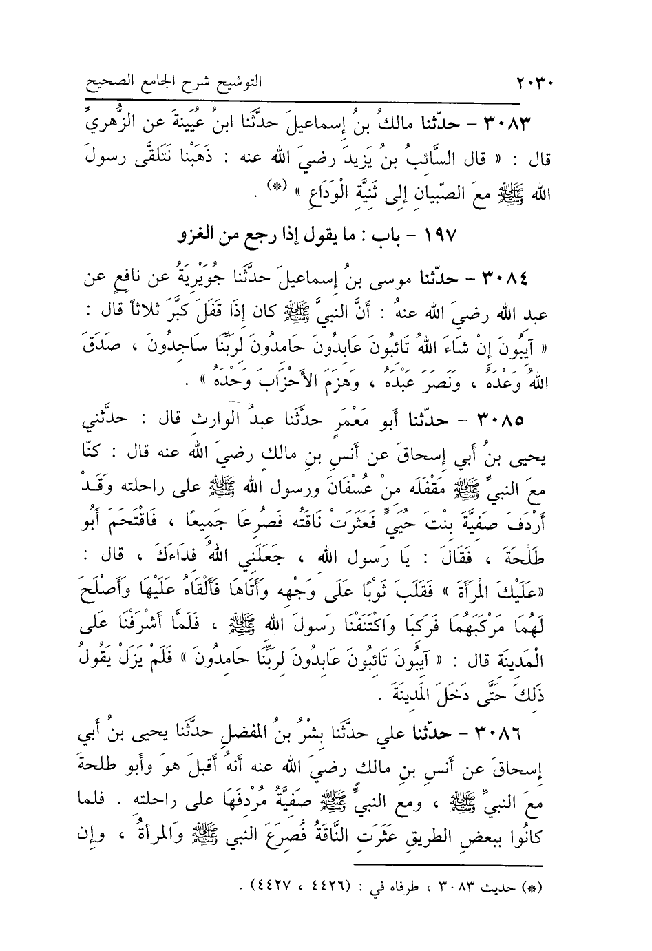 3085 - حَدَّثَنَا أَبُو مَعْمَرٍ، حَدَّثَنَا عَبْدُ الوَارِثِ، قَالَ: حَدَّثَنِي يَحْيَى بْنُ أَبِي إِسْحَاقَ، عَنْ أَنَسِ بْنِ مَالِكٍ رَضِيَ اللَّهُ عَنْهُ، قَالَ: كُنَّا مَعَ النَّبِيِّ صَلَّى اللهُ عَلَيْهِ وَسَلَّمَ مَقْفَلَهُ مِنْ عُسْفَانَ وَرَسُولُ اللَّهِ صلّى الله عليه وسلم عَلَى رَاحِلَتِهِ، وَقَدْ أَرْدَفَ صَفِيَّةَ بِنْتَ حُيَيٍّ، فَعَثَرَتْ نَاقَتُهُ، فَصُرِعَا جَمِيعًا، فَاقْتَحَمَ أَبُو طَلْحَةَ، فَقَالَ: يَا رَسُولَ اللَّهِ جَعَلَنِي اللَّهُ فِدَاءَكَ، قَالَ: «عَلَيْكَ المَرْأَةَ»، فَقَلَبَ ثَوْبًا عَلَى وَجْهِهِ، وَأَتَاهَا، فَأَلْقَاهُ عَلَيْهَا، وَأَصْلَحَ لَهُمَا مَرْكَبَهُمَا، فَرَكِبَا وَاكْتَنَفْنَا رَسُولَ اللَّهِ صَلَّى اللهُ عَلَيْهِ وَسَلَّمَ، فَلَمَّا أَشْرَفْنَا عَلَى المَدِينَةِ قَالَ: «آيِبُونَ تَائِبُونَ عَابِدُونَ لِرَبِّنَا حَامِدُونَ» فَلَمْ يَزَلْ يَقُولُ ذَلِكَ حَتَّى دَخَلَ المَدِينَةَ.