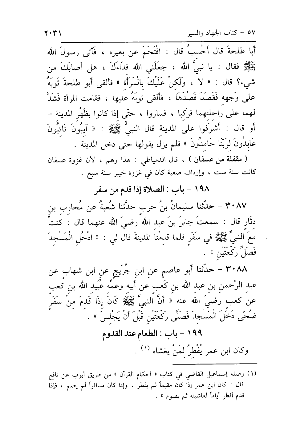 3088 - حَدَّثَنَا أَبُو عَاصِمٍ، عَنِ ابْنِ جُرَيْجٍ، عَنِ ابْنِ شِهَابٍ، عَنْ عَبْدِ الرَّحْمَنِ بْنِ عَبْدِ اللَّهِ بْنِ كَعْبٍ، عَنْ أَبِيهِ، وَعَمِّهِ عُبَيْدِ اللَّهِ بْنِ كَعْبٍ، عَنْ كَعْبٍ رَضِيَ اللَّهُ عَنْهُ: «أَنَّ النَّبِيَّ صَلَّى اللهُ عَلَيْهِ وَسَلَّمَ كَانَ إِذَا قَدِمَ مِنْ سَفَرٍ، ضُحًى دَخَلَ المَسْجِدَ، فَصَلَّى رَكْعَتَيْنِ قَبْلَ أَنْ يَجْلِسَ».