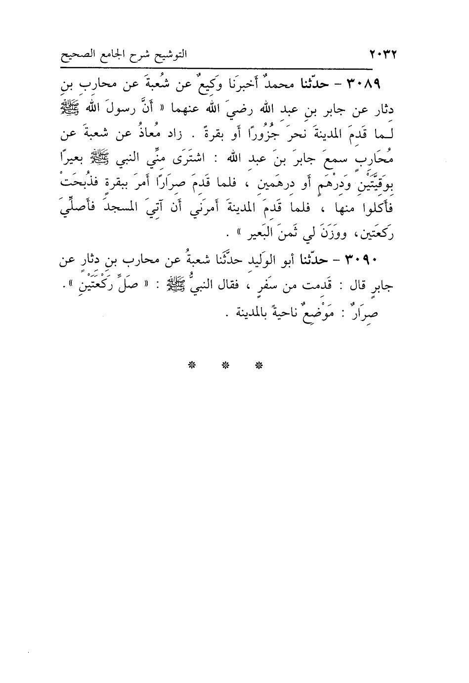 3090 - حَدَّثَنَا أَبُو الوَلِيدِ، حَدَّثَنَا شُعْبَةُ، عَنْ مُحَارِبِ بْنِ دِثَارٍ، عَنْ جَابِرٍ، قَالَ: قَدِمْتُ مِنْ سَفَرٍ فَقَالَ النَّبِيُّ صَلَّى اللهُ عَلَيْهِ وَسَلَّمَ: «صَلِّ رَكْعَتَيْنِ»، "صِرَارٌ: مَوْضِعٌ نَاحِيَةً بِالْمَدِينَةِ".