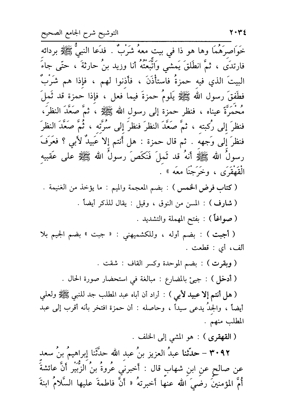 خَوَاصِرَهُمَا، وَهَا هُوَ ذَا فِي بَيْتٍ مَعَهُ شَرْبٌ، فَدَعَا النَّبِيُّ صَلَّى اللهُ عَلَيْهِ وَسَلَّمَ بِرِدَائِهِ، فَارْتَدَى، ثُمَّ انْطَلَقَ يَمْشِي وَاتَّبَعْتُهُ أَنَا وَزَيْدُ بْنُ حَارِثَةَ حَتَّى جَاءَ البَيْتَ الَّذِي فِيهِ حَمْزَةُ، فَاسْتَأْذَنَ، فَأَذِنُوا لَهُمْ، فَإِذَا هُمْ شَرْبٌ، «فَطَفِقَ رَسُولُ اللَّهِ صَلَّى اللهُ عَلَيْهِ وَسَلَّمَ يَلُومُ حَمْزَةَ فِيمَا فَعَلَ»، فَإِذَا حَمْزَةُ قَدْ ثَمِلَ، مُحْمَرَّةً عَيْنَاهُ، فَنَظَرَ حَمْزَةُ إِلَى رَسُولِ اللَّهِ صَلَّى اللهُ عَلَيْهِ وَسَلَّمَ، ثُمَّ صَعَّدَ النَّظَرَ، فَنَظَرَ إِلَى رُكْبَتِهِ، ثُمَّ صَعَّدَ النَّظَرَ، فَنَظَرَ إِلَى سُرَّتِهِ، ثُمَّ صَعَّدَ النَّظَرَ، فَنَظَرَ إِلَى وَجْهِهِ، ثُمَّ قَالَ حَمْزَةُ: هَلْ أَنْتُمْ إِلَّا عَبِيدٌ لِأَبِي؟ فَعَرَفَ رَسُولُ اللَّهِ صَلَّى اللهُ عَلَيْهِ وَسَلَّمَ أَنَّهُ قَدْ ثَمِلَ، فَنَكَصَ رَسُولُ اللَّهِ صَلَّى اللهُ عَلَيْهِ وَسَلَّمَ عَلَى عَقِبَيْهِ القَهْقَرَى، وَخَرَجْنَا مَعَهُ.