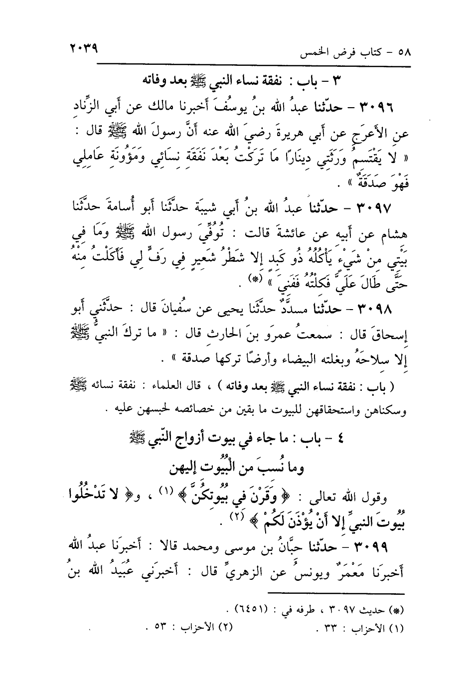 (باب: نفقة نساء النبي - صلى الله عليه وسلم - وفاته)، قال العلماء: نفقة نسائه - صلى الله عليه وسلم - وسكناهن واستحقاقهن للبيوت ما بقين من خصائصه لحبسهن عليه.