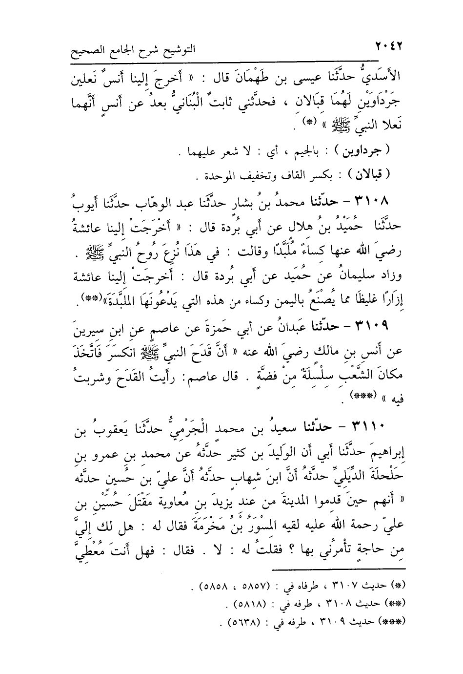 3110 - حَدَّثَنَا سَعِيدُ بْنُ مُحَمَّدٍ الجَرْمِيُّ، حَدَّثَنَا يَعْقُوبُ بْنُ إِبْرَاهِيمَ، حَدَّثَنَا أَبِي، أَنَّ الوَلِيدَ بْنَ كَثِيرٍ، حَدَّثَهُ عَنْ مُحَمَّدِ بْنِ عَمْرِو بْنِ حَلْحَلَةَ الدُّؤَلِيِّ، حَدَّثَهُ أَنَّ ابْنَ شِهَابٍ، حَدَّثَهُ أَنَّ عَلِيَّ بْنَ حُسَيْنٍ، حَدَّثَهُ: أَنَّهُمْ حِينَ قَدِمُوا المَدِينَةَ مِنْ عِنْدِ يَزِيدَ بْنِ مُعَاوِيَةَ مَقْتَلَ حُسَيْنِ بْنِ عَلِيٍّ رَحْمَةُ اللَّهِ عَلَيْهِ، لَقِيَهُ المِسْوَرُ بْنُ مَخْرَمَةَ، فَقَالَ لَهُ: هَلْ لَكَ إِلَيَّ مِنْ حَاجَةٍ تَأْمُرُنِي بِهَا؟ فَقُلْتُ لَهُ: لاَ، فَقَالَ لَهُ: فَهَلْ أَنْتَ مُعْطِيَّ