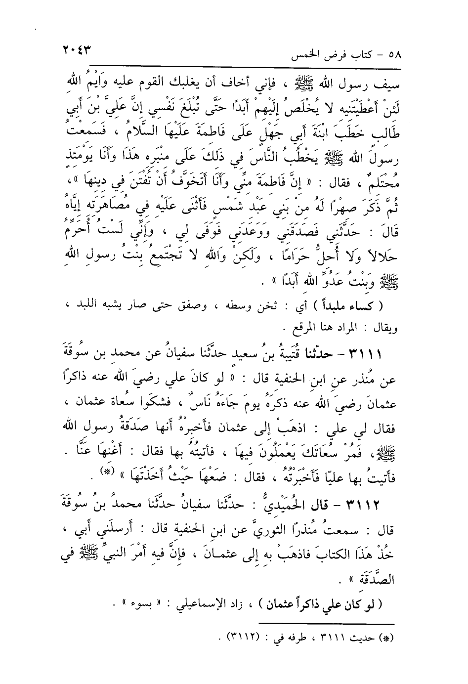 3112 - قَالَ الحُمَيْدِيُّ، حَدَّثَنَا سُفْيَانُ، حَدَّثَنَا مُحَمَّدُ بْنُ سُوقَةَ، قَالَ: سَمِعْتُ مُنْذِرًا الثَّوْرِيَّ، عَنْ ابْنِ الحَنَفِيَّةِ، قَالَ: أَرْسَلَنِي أَبِي، خُذْ هَذَا الكِتَابَ، فَاذْهَبْ بِهِ إِلَى عُثْمَانَ، فَإِنَّ فِيهِ أَمْرَ النَّبِيِّ صَلَّى اللهُ عَلَيْهِ وَسَلَّمَ فِي الصَّدَقَةِ.