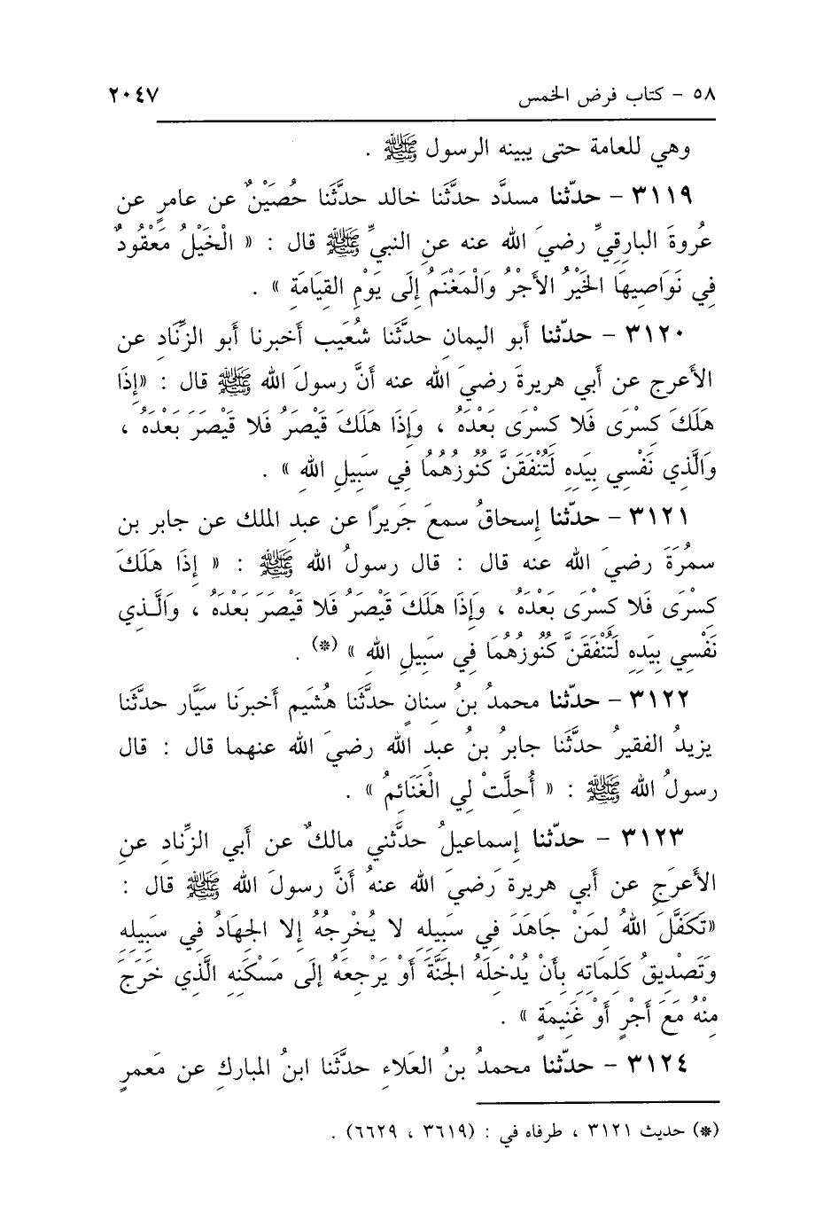 3119 - حَدَّثَنَا مُسَدَّدٌ، حَدَّثَنَا خَالِدٌ، حَدَّثَنَا حُصَيْنٌ، عَنْ عَامِرٍ، عَنْ عُرْوَةَ البَارِقِيِّ رَضِيَ اللَّهُ عَنْهُ، عَنِ النَّبِيِّ صَلَّى اللهُ عَلَيْهِ وَسَلَّمَ، قَالَ: «الخَيْلُ مَعْقُودٌ فِي نَوَاصِيهَا الخَيْرُ الأَجْرُ، وَالمَغْنَمُ إِلَى يَوْمِ القِيَامَةِ».