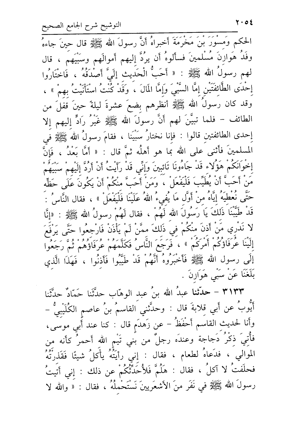 الحَكَمِ، وَمِسْوَرَ بْنَ مَخْرَمَةَ، أَخْبَرَاهُ أَنَّ رَسُولَ اللَّهِ صَلَّى اللهُ عَلَيْهِ وَسَلَّمَ، قَالَ حِينَ جَاءَهُ وَفْدُ هَوَازِنَ مُسْلِمِينَ: فَسَأَلُوهُ أَنْ يَرُدَّ إِلَيْهِمْ أَمْوَالَهُمْ وَسَبْيَهُمْ، فَقَالَ لَهُمْ رَسُولُ اللَّهِ صَلَّى اللهُ عَلَيْهِ وَسَلَّمَ: «أَحَبُّ الحَدِيثِ إِلَيَّ أَصْدَقُهُ، فَاخْتَارُوا إِحْدَى الطَّائِفَتَيْنِ، إِمَّا السَّبْيَ وَإِمَّا المَالَ، وَقَدْ كُنْتُ اسْتَأْنَيْتُ بِهِمْ»، وَقَدْ كَانَ رَسُولُ اللَّهِ صَلَّى اللهُ عَلَيْهِ وَسَلَّمَ انْتَظَرَ آخِرَهُمْ بِضْعَ عَشْرَةَ لَيْلَةً حِينَ قَفَلَ مِنَ الطَّائِفِ، فَلَمَّا تَبَيَّنَ لَهُمْ أَنَّ رَسُولَ اللَّهِ صَلَّى اللهُ عَلَيْهِ وَسَلَّمَ غَيْرُ رَادٍّ إِلَيْهِمْ إِلَّا إِحْدَى الطَّائِفَتَيْنِ قَالُوا: فَإِنَّا نَخْتَارُ سَبْيَنَا، فَقَامَ رَسُولُ اللَّهِ صَلَّى اللهُ عَلَيْهِ وَسَلَّمَ فِي المُسْلِمِينَ، فَأَثْنَى عَلَى اللَّهِ بِمَا هُوَ أَهْلُهُ، ثُمَّ قَالَ: «أَمَّا بَعْدُ، فَإِنَّ إِخْوَانَكُمْ هَؤُلاَءِ قَدْ جَاءُونَا تَائِبِينَ، وَإِنِّي قَدْ رَأَيْتُ أَنْ أَرُدَّ إِلَيْهِمْ سَبْيَهُمْ مَنْ أَحَبَّ أَنْ يُطَيِّبَ، فَلْيَفْعَلْ وَمَنْ أَحَبَّ مِنْكُمْ أَنْ يَكُونَ عَلَى حَظِّهِ حَتَّى نُعْطِيَهُ إِيَّاهُ مِنْ أَوَّلِ مَا يُفِيءُ اللَّهُ عَلَيْنَا فَلْيَفْعَلْ؟»، فَقَالَ النَّاسُ: قَدْ طَيَّبْنَا ذَلِكَ يَا رَسُولَ اللَّهِ لَهُمْ، فَقَالَ لَهُمْ رَسُولُ اللَّهِ صَلَّى اللهُ عَلَيْهِ وَسَلَّمَ: «إِنَّا لاَ نَدْرِي مَنْ أَذِنَ مِنْكُمْ فِي ذَلِكَ مِمَّنْ لَمْ يَأْذَنْ، فَارْجِعُوا حَتَّى يَرْفَعَ إِلَيْنَا عُرَفَاؤُكُمْ أَمْرَكُمْ»، فَرَجَعَ النَّاسُ فَكَلَّمَهُمْ عُرَفَاؤُهُمْ، ثُمَّ رَجَعُوا إِلَى رَسُولِ اللَّهِ صَلَّى اللهُ عَلَيْهِ وَسَلَّمَ، فَأَخْبَرُوهُ أَنَّهُمْ قَدْ طَيَّبُوا وَأَذِنُوا، فَهَذَا الَّذِي بَلَغَنَا عَنْ سَبْيِ هَوَازِنَ.