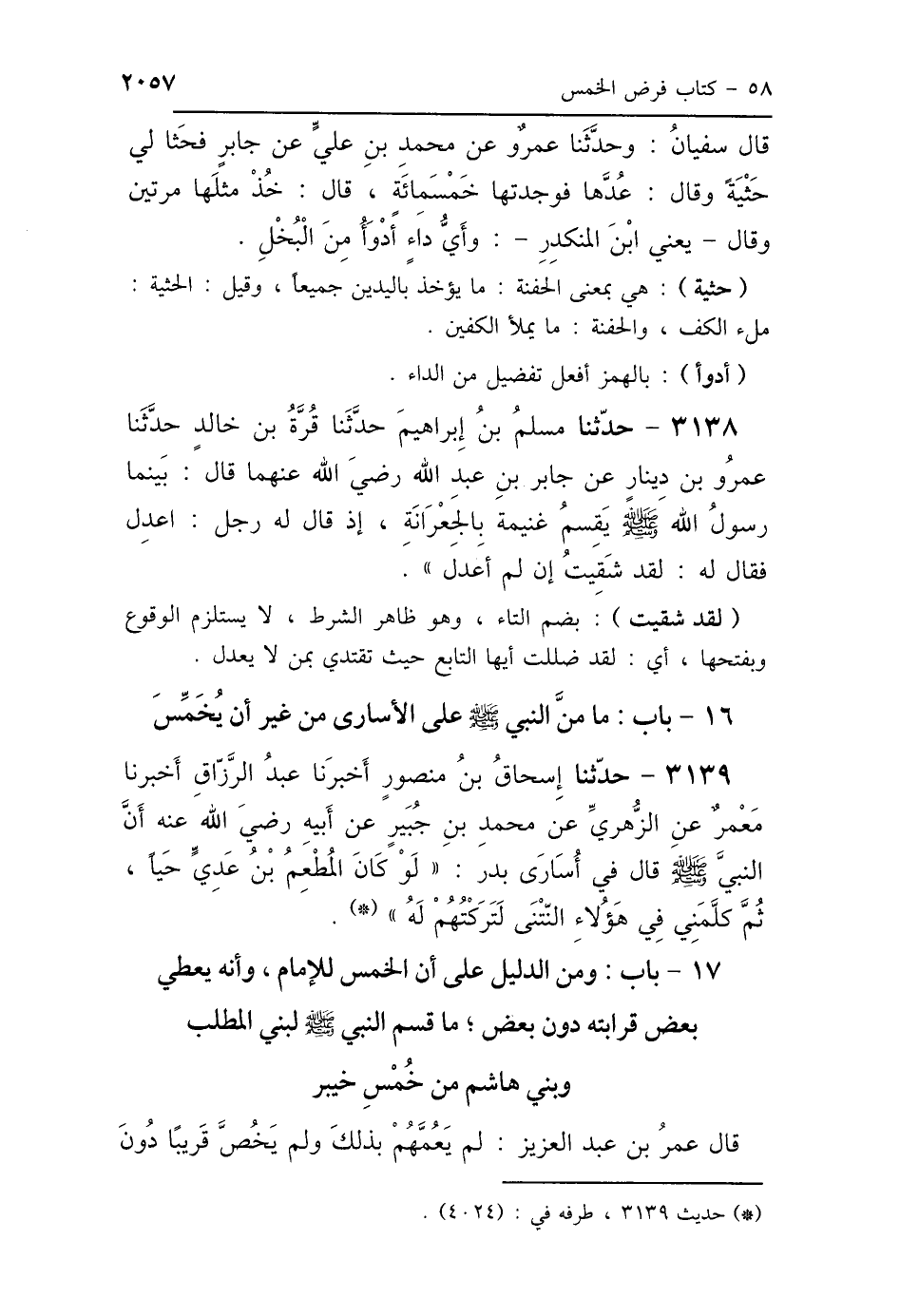 17 - بَابٌ: وَمِنَ الدَّلِيلِ عَلَى أَنَّ الخُمُسَ لِلْإِمَامِ «وَأَنَّهُ يُعْطِي بَعْضَ قَرَابَتِهِ دُونَ بَعْضٍ» مَا قَسَمَ النَّبِيُّ صَلَّى اللهُ عَلَيْهِ وَسَلَّمَ لِبَنِي المُطَّلِبِ، وَبَنِي هَاشِمٍ مِنْ خُمُسِ خَيْبَرَ