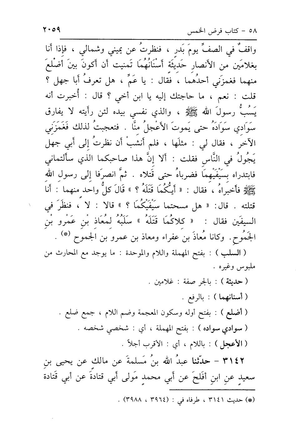 وَاقِفٌ فِي الصَّفِّ يَوْمَ بَدْرٍ، فَنَظَرْتُ عَنْ يَمِينِي وَعَنْ شِمَالِي، فَإِذَا أَنَا بِغُلاَمَيْنِ مِنَ الأَنْصَارِ - حَدِيثَةٍ أَسْنَانُهُمَا، تَمَنَّيْتُ أَنْ أَكُونَ بَيْنَ أَضْلَعَ مِنْهُمَا - فَغَمَزَنِي أَحَدُهُمَا فَقَالَ: يَا عَمِّ هَلْ تَعْرِفُ أَبَا جَهْلٍ؟ قُلْتُ: نَعَمْ، مَا حَاجَتُكَ إِلَيْهِ يَا ابْنَ أَخِي؟ قَالَ: أُخْبِرْتُ أَنَّهُ يَسُبُّ رَسُولَ اللَّهِ صَلَّى اللهُ عَلَيْهِ وَسَلَّمَ، وَالَّذِي نَفْسِي بِيَدِهِ، لَئِنْ رَأَيْتُهُ لاَ يُفَارِقُ سَوَادِي سَوَادَهُ حَتَّى يَمُوتَ الأَعْجَلُ مِنَّا، فَتَعَجَّبْتُ لِذَلِكَ، فَغَمَزَنِي الآخَرُ، فَقَالَ لِي مِثْلَهَا، فَلَمْ أَنْشَبْ أَنْ نَظَرْتُ إِلَى أَبِي جَهْلٍ يَجُولُ فِي النَّاسِ، قُلْتُ: أَلاَ إِنَّ هَذَا صَاحِبُكُمَا الَّذِي سَأَلْتُمَانِي، فَابْتَدَرَاهُ بِسَيْفَيْهِمَا، فَضَرَبَاهُ حَتَّى قَتَلاَهُ، ثُمَّ انْصَرَفَا إِلَى رَسُولِ اللَّهِ صَلَّى اللهُ عَلَيْهِ وَسَلَّمَ، فَأَخْبَرَاهُ فَقَالَ: «أَيُّكُمَا قَتَلَهُ؟»، قَالَ كُلُّ وَاحِدٍ مِنْهُمَا: أَنَا قَتَلْتُهُ، فَقَالَ: «هَلْ مَسَحْتُمَا سَيْفَيْكُمَا؟»، قَالاَ: لاَ، فَنَظَرَ فِي السَّيْفَيْنِ، فَقَالَ: «كِلاَكُمَا قَتَلَهُ، سَلَبُهُ لِمُعَاذِ بْنِ عَمْرِو بْنِ الجَمُوحِ»، وَكَانَا مُعَاذَ ابْنَ عَفْرَاءَ، وَمُعَاذَ بْنَ عَمْرِو بْنِ الجَمُوحِ، "قَالَ مُحَمَّدٌ: سَمِعَ يُوسُفُ صَالِحًا، وَإِبْرَاهِيمَ أَبَاهُ".