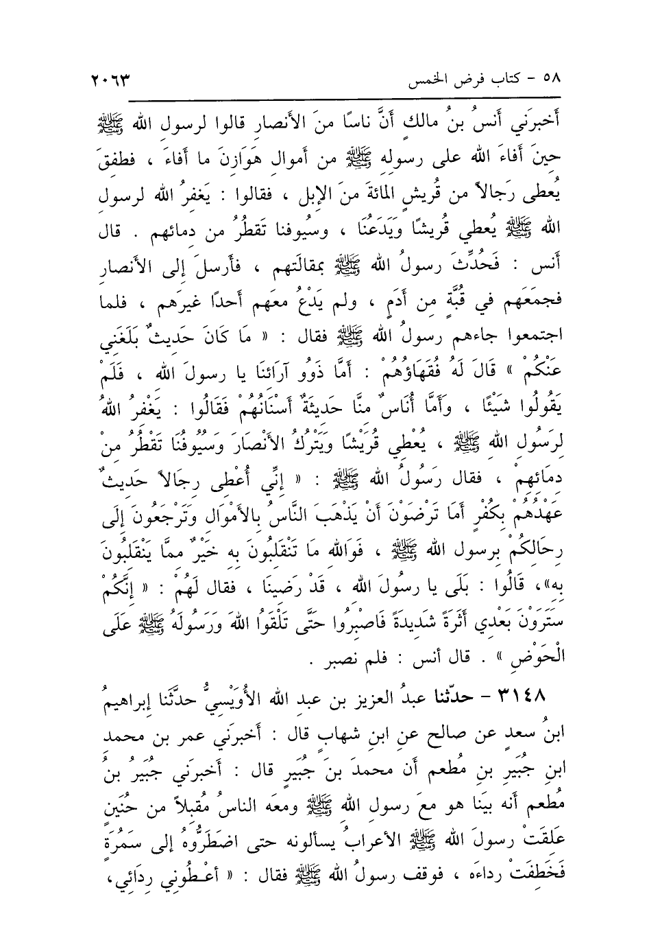أَخْبَرَنِي أَنَسُ بْنُ مَالِكٍ، أَنَّ نَاسًا مِنَ الأَنْصَارِ قَالُوا لِرَسُولِ اللَّهِ صَلَّى اللهُ عَلَيْهِ وَسَلَّمَ، حِينَ أَفَاءَ اللَّهُ عَلَى رَسُولِهِ صَلَّى اللهُ عَلَيْهِ وَسَلَّمَ مِنْ أَمْوَالِ هَوَازِنَ مَا أَفَاءَ، فَطَفِقَ يُعْطِي رِجَالًا مِنْ قُرَيْشٍ المِائَةَ مِنَ الإِبِلِ، فَقَالُوا: يَغْفِرُ اللَّهُ لِرَسُولِ اللَّهِ صَلَّى اللهُ عَلَيْهِ وَسَلَّمَ، يُعْطِي قُرَيْشًا وَيَدَعُنَا، وَسُيُوفُنَا تَقْطُرُ مِنْ دِمَائِهِمْ، قَالَ أَنَسٌ: فَحُدِّثَ رَسُولُ اللَّهِ صَلَّى اللهُ عَلَيْهِ وَسَلَّمَ بِمَقَالَتِهِمْ، فَأَرْسَلَ إِلَى الأَنْصَارِ، فَجَمَعَهُمْ فِي قُبَّةٍ مِنْ أَدَمٍ، وَلَمْ يَدْعُ مَعَهُمْ أَحَدًا غَيْرَهُمْ، فَلَمَّا اجْتَمَعُوا جَاءَهُمْ رَسُولُ اللَّهِ صَلَّى اللهُ عَلَيْهِ وَسَلَّمَ فَقَالَ: «مَا كَانَ حَدِيثٌ بَلَغَنِي عَنْكُمْ». قَالَ لَهُ فُقَهَاؤُهُمْ: أَمَّا ذَوُو آرَائِنَا يَا رَسُولَ اللَّهِ، فَلَمْ يَقُولُوا شَيْئًا، وَأَمَّا أُنَاسٌ مِنَّا حَدِيثَةٌ أَسْنَانُهُمْ، فَقَالُوا: يَغْفِرُ اللَّهُ لِرَسُولِ اللَّهِ صَلَّى اللهُ عَلَيْهِ وَسَلَّمَ، يُعْطِي قُرَيْشًا، وَيَتْرُكُ الأَنْصَارَ، وَسُيُوفُنَا تَقْطُرُ مِنْ دِمَائِهِمْ، فَقَالَ رَسُولُ اللَّهِ صَلَّى اللهُ عَلَيْهِ وَسَلَّمَ: «إِنِّي أُعْطِي رِجَالًا حَدِيثٌ عَهْدُهُمْ بِكُفْرٍ، أَمَا تَرْضَوْنَ أَنْ يَذْهَبَ النَّاسُ بِالأَمْوَالِ، وَتَرْجِعُوا إِلَى رِحَالِكُمْ بِرَسُولِ اللَّهِ صَلَّى اللهُ عَلَيْهِ وَسَلَّمَ، فَوَاللَّهِ مَا تَنْقَلِبُونَ بِهِ خَيْرٌ مِمَّا يَنْقَلِبُونَ بِهِ»، قَالُوا: بَلَى يَا رَسُولَ اللَّهِ، قَدْ رَضِينَا، فَقَالَ لَهُمْ: «إِنَّكُمْ سَتَرَوْنَ بَعْدِي أَثَرَةً شَدِيدَةً، فَاصْبِرُوا حَتَّى تَلْقَوُا اللَّهَ وَرَسُولَهُ صَلَّى اللهُ عَلَيْهِ وَسَلَّمَ عَلَى الحَوْضِ» قَالَ أَنَسٌ فَلَمْ نَصْبِرْ.