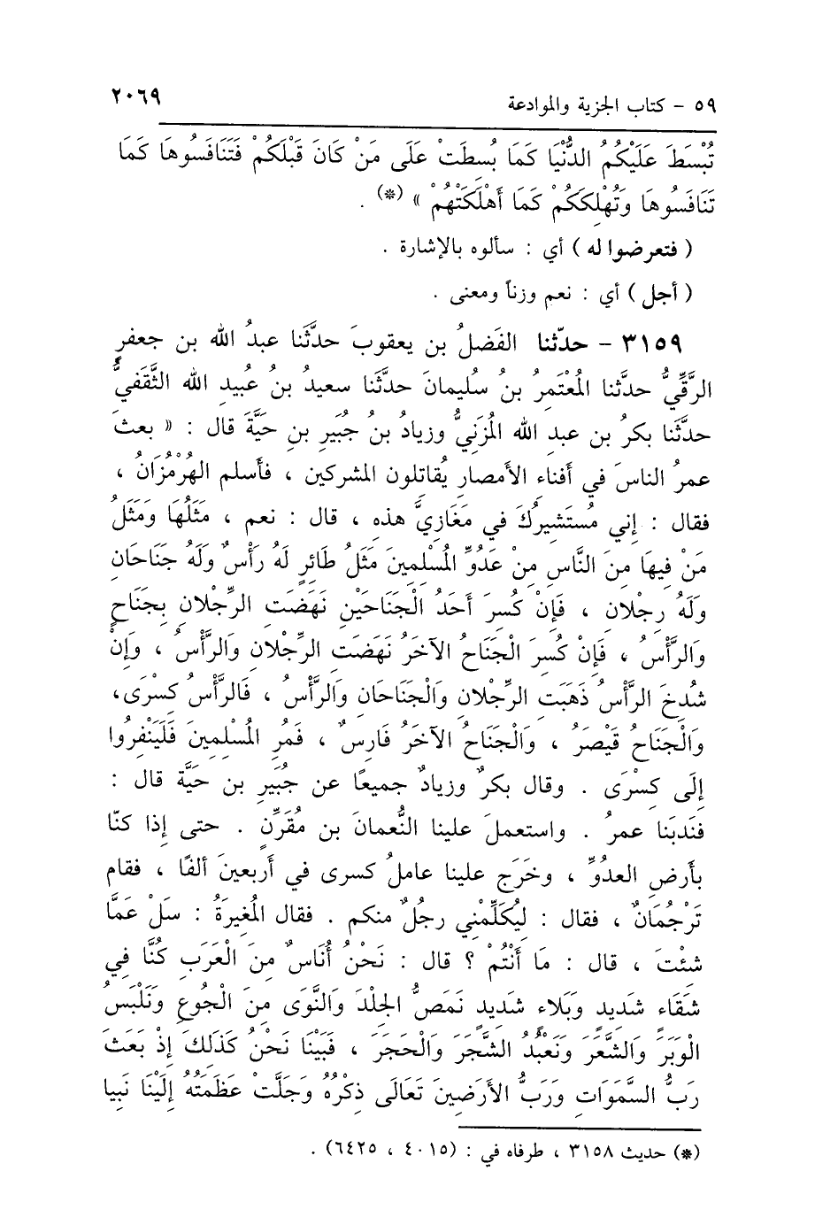 3159 - حَدَّثَنَا الفَضْلُ بْنُ يَعْقُوبَ، حَدَّثَنَا عَبْدُ اللَّهِ بْنُ جَعْفَرٍ الرَّقِّيُّ، حَدَّثَنَا المُعْتَمِرُ بْنُ سُلَيْمَانَ، حَدَّثَنَا سَعِيدُ بْنُ عُبَيْدِ اللَّهِ الثَّقَفِيُّ، حَدَّثَنَا بَكْرُ بْنُ عَبْدِ اللَّهِ المُزَنِيُّ، وَزِيَادُ بْنُ جُبَيْرٍ، عَنْ جُبَيْرِ بْنِ حَيَّةَ، قَالَ: بَعَثَ عُمَرُ النَّاسَ فِي أَفْنَاءِ الأَمْصَارِ، يُقَاتِلُونَ المُشْرِكِينَ، فَأَسْلَمَ الهُرْمُزَانُ، فَقَالَ: إِنِّي مُسْتَشِيرُكَ فِي مَغَازِيَّ هَذِهِ؟ قَالَ: نَعَمْ مَثَلُهَا وَمَثَلُ مَنْ فِيهَا مِنَ النَّاسِ مِنْ عَدُوِّ المُسْلِمِينَ مَثَلُ طَائِرٍ لَهُ رَأْسٌ وَلَهُ جَنَاحَانِ وَلَهُ رِجْلاَنِ، فَإِنْ كُسِرَ أَحَدُ الجَنَاحَيْنِ نَهَضَتِ الرِّجْلاَنِ بِجَنَاحٍ وَالرَّأْسُ، فَإِنْ كُسِرَ الجَنَاحُ الآخَرُ نَهَضَتِ الرِّجْلاَنِ وَالرَّأْسُ، وَإِنْ شُدِخَ الرَّأْسُ ذَهَبَتِ الرِّجْلاَنِ وَالجَنَاحَانِ وَالرَّأْسُ، فَالرَّأْسُ كِسْرَى، وَالجَنَاحُ قَيْصَرُ، وَالجَنَاحُ الآخَرُ فَارِسُ، فَمُرِ المُسْلِمِينَ، فَلْيَنْفِرُوا إِلَى كِسْرَى، - وَقَالَ بَكْرٌ، وَزِيَادٌ جَمِيعًا عَنْ جُبَيْرِ بْنِ حَيَّةَ - قَالَ: فَنَدَبَنَا عُمَرُ، وَاسْتَعْمَلَ عَلَيْنَا النُّعْمَانَ بْنَ مُقَرِّنٍ، حَتَّى إِذَا كُنَّا بِأَرْضِ العَدُوِّ، وَخَرَجَ عَلَيْنَا عَامِلُ كِسْرَى فِي أَرْبَعِينَ أَلْفًا، فَقَامَ تَرْجُمَانٌ، فَقَالَ: لِيُكَلِّمْنِي رَجُلٌ مِنْكُمْ، فَقَالَ المُغِيرَةُ: سَلْ عَمَّا شِئْتَ؟ قَالَ: مَا أَنْتُمْ؟ قَالَ: نَحْنُ أُنَاسٌ مِنَ العَرَبِ، كُنَّا فِي شَقَاءٍ شَدِيدٍ وَبَلاَءٍ شَدِيدٍ، نَمَصُّ الجِلْدَ وَالنَّوَى مِنَ الجُوعِ، وَنَلْبَسُ الوَبَرَ وَالشَّعَرَ، وَنَعْبُدُ الشَّجَرَ وَالحَجَرَ، فَبَيْنَا نَحْنُ كَذَلِكَ إِذْ بَعَثَ رَبُّ السَّمَوَاتِ وَرَبُّ الأَرَضِينَ - تَعَالَى ذِكْرُهُ وَجَلَّتْ عَظَمَتُهُ - إِلَيْنَا نَبِيًّا
