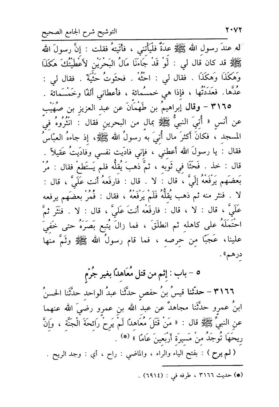 3165 - وَقَالَ إِبْرَاهِيمُ بْنُ طَهْمَانَ، عَنْ عَبْدِ العَزِيزِ بْنِ صُهَيْبٍ، عَنْ أَنَسٍ، أُتِيَ النَّبِيُّ صَلَّى اللهُ عَلَيْهِ وَسَلَّمَ بِمَالٍ مِنَ البَحْرَيْنِ، فَقَالَ: «انْثُرُوهُ فِي المَسْجِدِ»، فَكَانَ أَكْثَرَ مَالٍ أُتِيَ بِهِ رَسُولُ اللَّهِ صَلَّى اللهُ عَلَيْهِ وَسَلَّمَ، إِذْ جَاءَهُ العَبَّاسُ، فَقَالَ: يَا رَسُولَ اللَّهِ، أَعْطِنِي إِنِّي فَادَيْتُ نَفْسِي وَفَادَيْتُ عَقِيلًا، قَالَ: «خُذْ»، فَحَثَا فِي ثَوْبِهِ، ثُمَّ ذَهَبَ يُقِلُّهُ فَلَمْ يَسْتَطِعْ، فَقَالَ: اؤْمُرْ بَعْضَهُمْ يَرْفَعْهُ إِلَيَّ، قَالَ: «لاَ» قَالَ: فَارْفَعْهُ أَنْتَ عَلَيَّ، قَالَ: «لاَ»، فَنَثَرَ مِنْهُ، ثُمَّ ذَهَبَ يُقِلُّهُ فَلَمْ يَرْفَعْهُ، فَقَالَ: فَمُرْ بَعْضَهُمْ يَرْفَعْهُ عَلَيَّ، قَالَ: «لاَ»، قَالَ: فَارْفَعْهُ أَنْتَ عَلَيَّ، قَالَ: «لاَ»، فَنَثَرَ مِنْهُ، ثُمَّ احْتَمَلَهُ عَلَى كَاهِلِهِ، ثُمَّ انْطَلَقَ فَمَا زَالَ يُتْبِعُهُ بَصَرَهُ حَتَّى خَفِيَ عَلَيْنَا، عَجَبًا مِنْ حِرْصِهِ، فَمَا قَامَ رَسُولُ اللَّهِ صلّى الله عليه وسلم وَثَمَّ مِنْهَا دِرْهَمٌ.