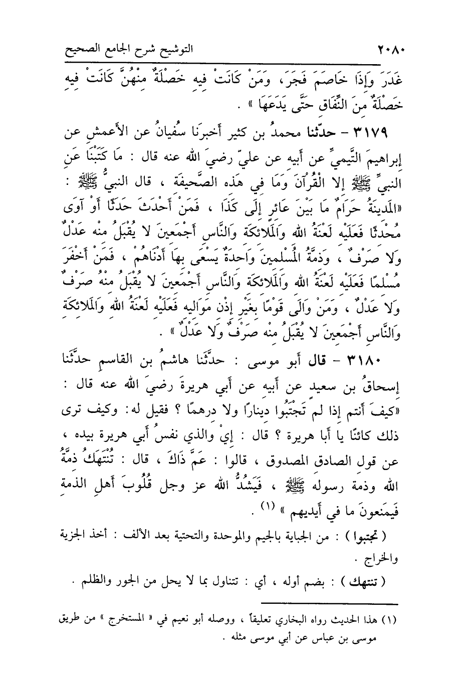 3179 - حَدَّثَنَا مُحَمَّدُ بْنُ كَثِيرٍ، أَخْبَرَنَا سُفْيَانُ، عَنِ الأَعْمَشِ، عَنْ إِبْرَاهِيمَ التَّيْمِيِّ، عَنْ أَبِيهِ، عَنْ عَلِيٍّ رَضِيَ اللَّهُ عَنْهُ، قَالَ: مَا كَتَبْنَا عَنِ النَّبِيِّ صَلَّى اللهُ عَلَيْهِ وَسَلَّمَ إِلَّا القُرْآنَ وَمَا فِي هَذِهِ الصَّحِيفَةِ، قَالَ النَّبِيُّ صَلَّى اللهُ عَلَيْهِ وَسَلَّمَ: «المَدِينَةُ حَرَامٌ مَا بَيْنَ عَائِرٍ إِلَى كَذَا، فَمَنْ أَحْدَثَ حَدَثًا أَوْ آوَى مُحْدِثًا فَعَلَيْهِ لَعْنَةُ اللَّهِ وَالمَلاَئِكَةِ وَالنَّاسِ أَجْمَعِينَ، لاَ يُقْبَلُ مِنْهُ عَدْلٌ وَلاَ صَرْفٌ، وَذِمَّةُ المُسْلِمِينَ وَاحِدَةٌ، يَسْعَى بِهَا أَدْنَاهُمْ، فَمَنْ أَخْفَرَ مُسْلِمًا، فَعَلَيْهِ لَعْنَةُ اللَّهِ وَالمَلاَئِكَةِ وَالنَّاسِ أَجْمَعِينَ، لاَ يُقْبَلُ مِنْهُ صَرْفٌ وَلاَ عَدْلٌ، وَمَنْ وَالَى قَوْمًا بِغَيْرِ إِذْنِ مَوَالِيهِ، فَعَلَيْهِ لَعْنَةُ اللَّهِ وَالمَلاَئِكَةِ وَالنَّاسِ أَجْمَعِينَ، لاَ يُقْبَلُ مِنْهُ صَرْفٌ وَلاَ عَدْلٌ»