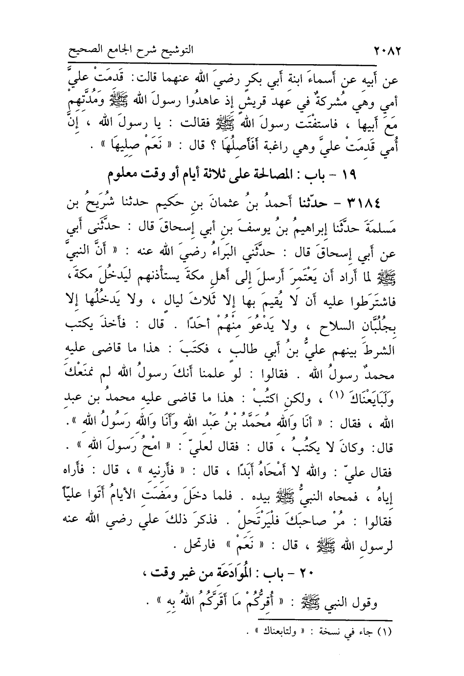 3184 - حَدَّثَنَا أَحْمَدُ بْنُ عُثْمَانَ بْنِ حَكِيمٍ، حَدَّثَنَا شُرَيْحُ بْنُ مَسْلَمَةَ، حَدَّثَنَا إِبْرَاهِيمُ بْنُ يُوسُفَ بْنِ أَبِي إِسْحَاقَ، قَالَ: حَدَّثَنِي أَبِي، عَنْ أَبِي إِسْحَاقَ، قَالَ: حَدَّثَنِي البَرَاءُ رَضِيَ اللَّهُ عَنْهُ: أَنَّ النَّبِيَّ صَلَّى اللهُ عَلَيْهِ وَسَلَّمَ لَمَّا أَرَادَ أَنْ يَعْتَمِرَ أَرْسَلَ إِلَى أَهْلِ مَكَّةَ يَسْتَأْذِنُهُمْ لِيَدْخُلَ مَكَّةَ، فَاشْتَرَطُوا عَلَيْهِ أَنْ لاَ يُقِيمَ بِهَا إِلَّا ثَلاَثَ لَيَالٍ، وَلاَ يَدْخُلَهَا إِلَّا بِجُلُبَّانِ السِّلاَحِ، وَلاَ يَدْعُوَ مِنْهُمْ أَحَدًا، قَالَ: فَأَخَذَ يَكْتُبُ الشَّرْطَ بَيْنهُمْ عَلِيُّ بْنُ أَبِي طَالِبٍ فَكَتَبَ هَذَا مَا قَاضَى عَلَيْهِ مُحَمَّدٌ رَسُولُ اللَّهِ، فَقَالُوا: لَوْ عَلِمْنَا أَنَّكَ رَسُولُ اللَّهِ لَمْ نَمْنَعْكَ وَلَبَايَعْنَاكَ، وَلكِنِ اكْتُبْ هَذَا مَا قَاضَى عَلَيْهِ مُحَمَّدُ بْنُ عَبْدِ اللَّهِ، فَقَالَ: «أَنَا وَاللَّهِ مُحَمَّدُ بْنُ عَبْدِ اللَّهِ، وَأَنَا وَاللَّهِ رَسُولُ اللَّهِ» قَالَ: وَكَانَ لاَ يَكْتُبُ، قَالَ: فَقَالَ لِعَلِيٍّ: «امْحَ رَسُولَ اللَّهِ» فَقَالَ عَلِيٌّ: وَاللَّهِ لاَ أَمْحَاهُ أَبَدًا، قَالَ: «فَأَرِنِيهِ»، قَالَ: فَأَرَاهُ إِيَّاهُ فَمَحَاهُ النَّبِيُّ صَلَّى اللهُ عَلَيْهِ وَسَلَّمَ بِيَدِهِ، فَلَمَّا دَخَلَ وَمَضَتِ الأَيَّامُ، أَتَوْا عَلِيًّا، فَقَالُوا: مُرْ صَاحِبَكَ فَلْيَرْتَحِلْ، فَذَكَرَ ذَلِكَ عَلِيٌّ رَضِيَ اللَّهُ عَنْهُ لِرَسُولِ اللَّهِ صَلَّى اللهُ عَلَيْهِ وَسَلَّمَ، فَقَالَ: «نَعَمْ» ثُمَّ ارْتَحَلَ.