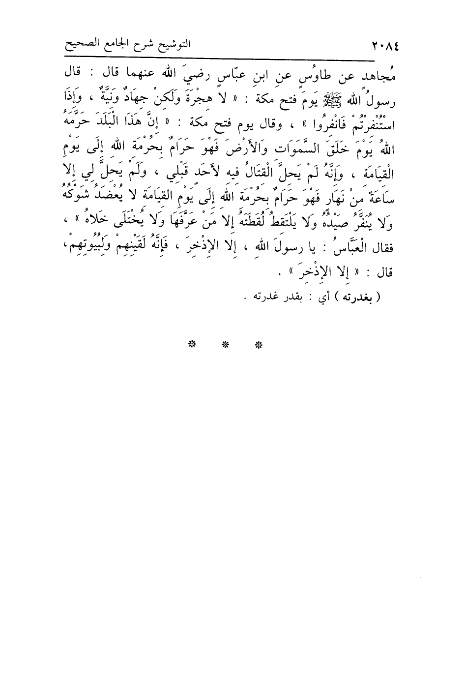 مُجَاهِدٍ، عَنْ طَاوُسٍ، عَنِ ابْنِ عَبَّاسٍ رَضِيَ اللَّهُ عَنْهُمَا، قَالَ: قَالَ رَسُولُ اللَّهِ صَلَّى اللهُ عَلَيْهِ وَسَلَّمَ يَوْمَ فَتْحِ مَكَّةَ: «لاَ هِجْرَةَ، وَلَكِنْ جِهَادٌ وَنِيَّةٌ وَإِذَا اسْتُنْفِرْتُمْ، فَانْفِرُوا» وَقَالَ يَوْمَ فَتْحِ مَكَّةَ: «إِنَّ هَذَا البَلَدَ حَرَّمَهُ اللَّهُ يَوْمَ خَلَقَ السَّمَوَاتِ وَالأَرْضَ، فَهُوَ حَرَامٌ بِحُرْمَةِ اللَّهِ إِلَى يَوْمِ القِيَامَةِ، وَإِنَّهُ لَمْ يَحِلَّ القِتَالُ فِيهِ لِأَحَدٍ قَبْلِي، وَلَمْ يَحِلَّ لِي إِلَّا سَاعَةً مِنْ نَهَارٍ، فَهُوَ حَرَامٌ بِحُرْمَةِ اللَّهِ إِلَى يَوْمِ القِيَامَةِ، لاَ يُعْضَدُ شَوْكُهُ، وَلاَ يُنَفَّرُ صَيْدُهُ، وَلاَ يَلْتَقِطُ لُقَطَتَهُ إِلَّا مَنْ عَرَّفَهَا، وَلاَ يُخْتَلَى خَلاَهُ» فَقَالَ العَبَّاسُ: يَا رَسُولَ اللَّهِ، إِلَّا الإِذْخِرَ فَإِنَّهُ لِقَيْنِهِمْ وَلِبُيُوتِهِمْ، قَالَ: «إِلَّا الإِذْخِرَ».