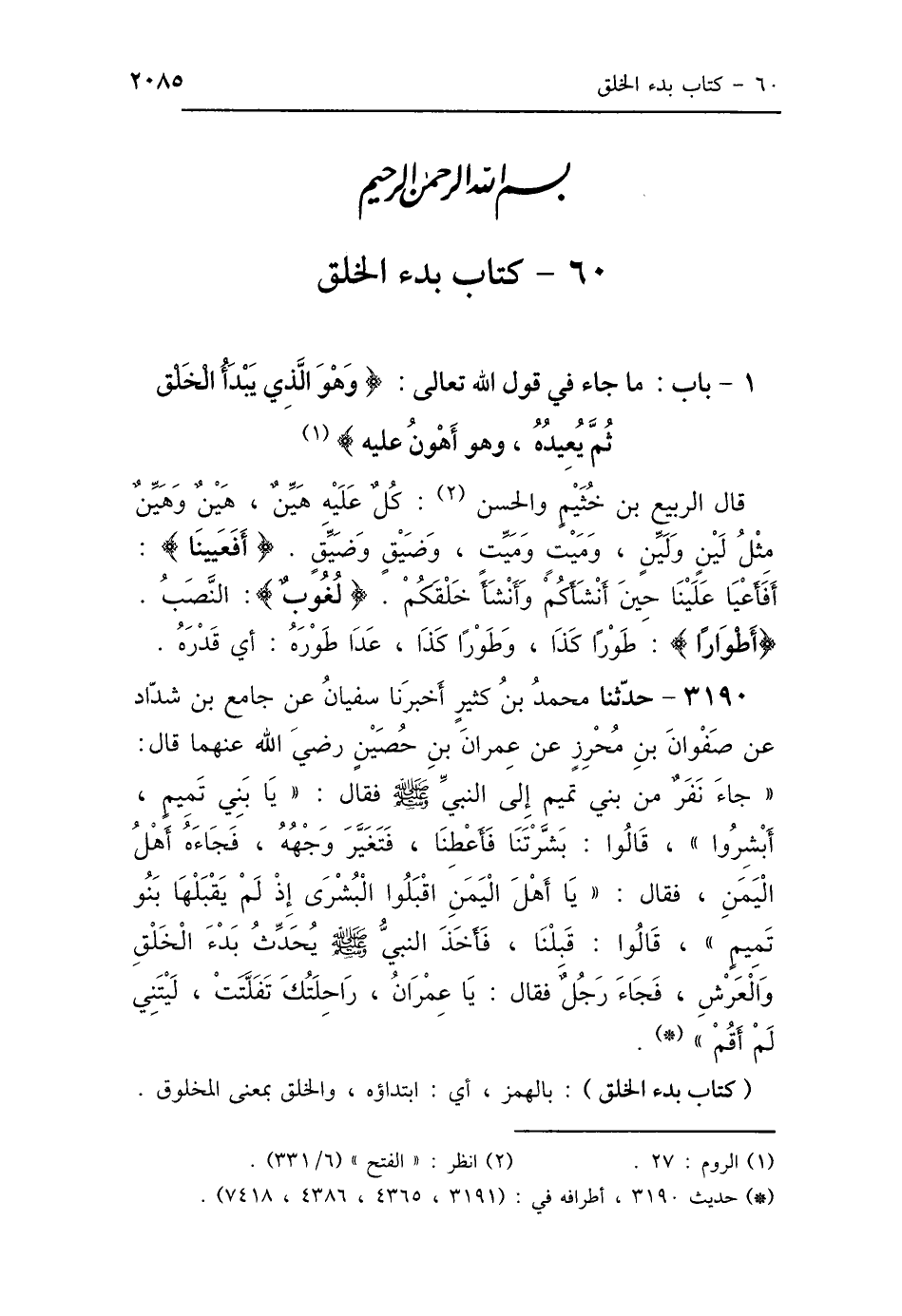 3190 - حَدَّثَنَا مُحَمَّدُ بْنُ كَثِيرٍ، أَخْبَرَنَا سُفْيَانُ، عَنْ جَامِعِ بْنِ شَدَّادٍ، عَنْ صَفْوَانَ بْنِ مُحْرِزٍ، عَنْ عِمْرَانَ بْنِ حُصَيْنٍ رَضِيَ اللَّهُ عَنْهُمَا، قَالَ: جَاءَ نَفَرٌ مِنْ بَنِي تَمِيمٍ إِلَى النَّبِيِّ صَلَّى اللهُ عَلَيْهِ وَسَلَّمَ، فَقَالَ: «يَا بَنِي تَمِيمٍ أَبْشِرُوا» قَالُوا: بَشَّرْتَنَا فَأَعْطِنَا، فَتَغَيَّرَ وَجْهُهُ، فَجَاءَهُ أَهْلُ اليَمَنِ، فَقَالَ: «يَا أَهْلَ اليَمَنِ، اقْبَلُوا البُشْرَى إِذْ لَمْ يَقْبَلْهَا بَنُو تَمِيمٍ»، قَالُوا: قَبِلْنَا، فَأَخَذَ النَّبِيُّ صَلَّى اللهُ عَلَيْهِ وَسَلَّمَ يُحَدِّثُ بَدْءَ الخَلْقِ وَالعَرْشِ، فَجَاءَ رَجُلٌ فَقَالَ: يَا عِمْرَانُ رَاحِلَتُكَ تَفَلَّتَتْ، لَيْتَنِي لَمْ أَقُمْ.
