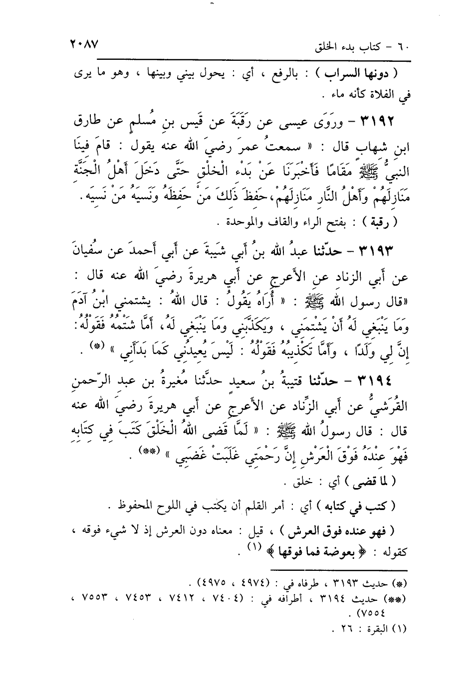 3193 - حَدَّثَنِي عَبْدُ اللَّهِ بْنُ أَبِي شَيْبَةَ، عَنْ أَبِي أَحْمَدَ، عَنْ سُفْيَانَ، عَنْ أَبِي الزِّنَادِ، عَنِ الأَعْرَجِ، عَنْ أَبِي هُرَيْرَةَ رَضِيَ اللَّهُ عَنْهُ، قَالَ: قَالَ النَّبِيُّ صَلَّى اللهُ عَلَيْهِ وَسَلَّمَ: " أُرَاهُ قَالَ اللَّهُ تَعَالَى: يَشْتِمُنِي ابْنُ آدَمَ، وَمَا يَنْبَغِي لَهُ أَنْ يَشْتِمَنِي، وَيُكَذِّبُنِي وَمَا يَنْبَغِي لَهُ، أَمَّا شَتْمُهُ فَقَوْلُهُ: إِنَّ لِي وَلَدًا، وَأَمَّا تَكْذِيبُهُ فَقَوْلُهُ: لَيْسَ يُعِيدُنِي كَمَا بَدَأَنِي".