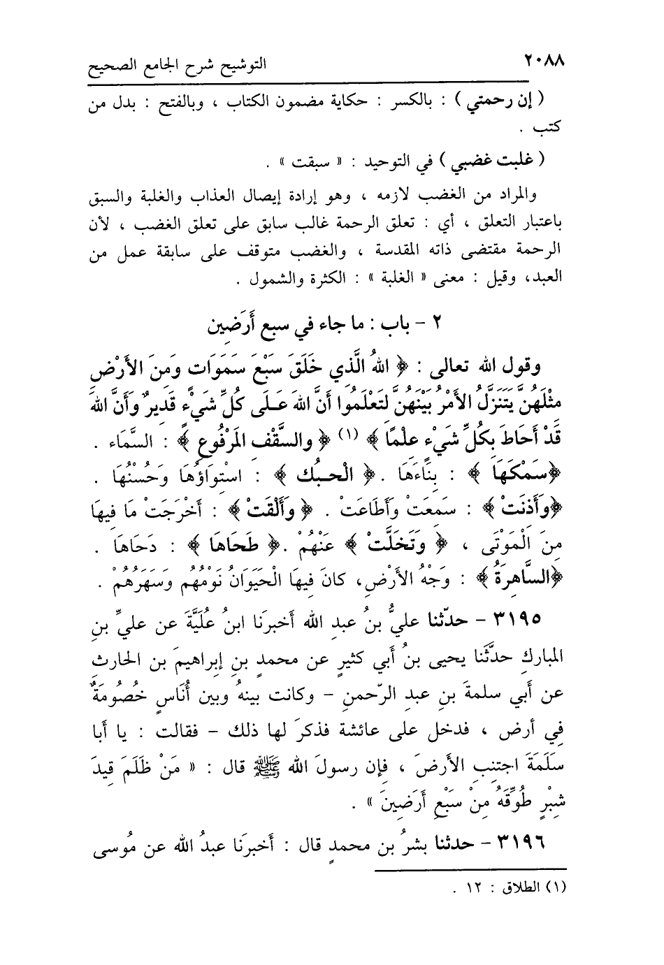 وَقَوْلِ اللَّهِ تَعَالَى: {اللَّهُ الَّذِي خَلَقَ سَبْعَ سَمَوَاتٍ وَمِنَ الأَرْضِ مِثْلَهُنَّ يَتَنَزَّلُ الأَمْرُ بَيْنَهُنَّ لِتَعْلَمُوا أَنَّ اللَّهَ عَلَى كُلِّ شَيْءٍ قَدِيرٌ وَأَنَّ اللَّهَ قَدْ أَحَاطَ بِكُلِّ شَيْءٍ عِلْمًا} {وَالسَّقْفِ المَرْفُوعِ} [الطور: 5]: «السَّمَاءُ»، {سَمْكَهَا} [النازعات: 28]: «بِنَاءَهَا»، {الحُبُكُ} [الذاريات: 7]: اسْتِوَاؤُهَا وَحُسْنُهَا، {وَأَذِنَتْ} [الانشقاق: 2]: «سَمِعَتْ وَأَطَاعَتْ»، {وَأَلْقَتْ} [الانشقاق: 4] «أَخْرَجَتْ»، {مَا فِيهَا} [الانشقاق: 4] «مِنَ المَوْتَى»، {وَتَخَلَّتْ} [الانشقاق: 4]: «عَنْهُمْ»، {طَحَاهَا} [الشمس: 6] «دَحَاهَا»، {بِالسَّاهِرَةِ} [النازعات: 14]: «وَجْهُ الأَرْضِ، كَانَ فِيهَا الحَيَوَانُ نَوْمُهُمْ وَسَهَرُهُمْ».