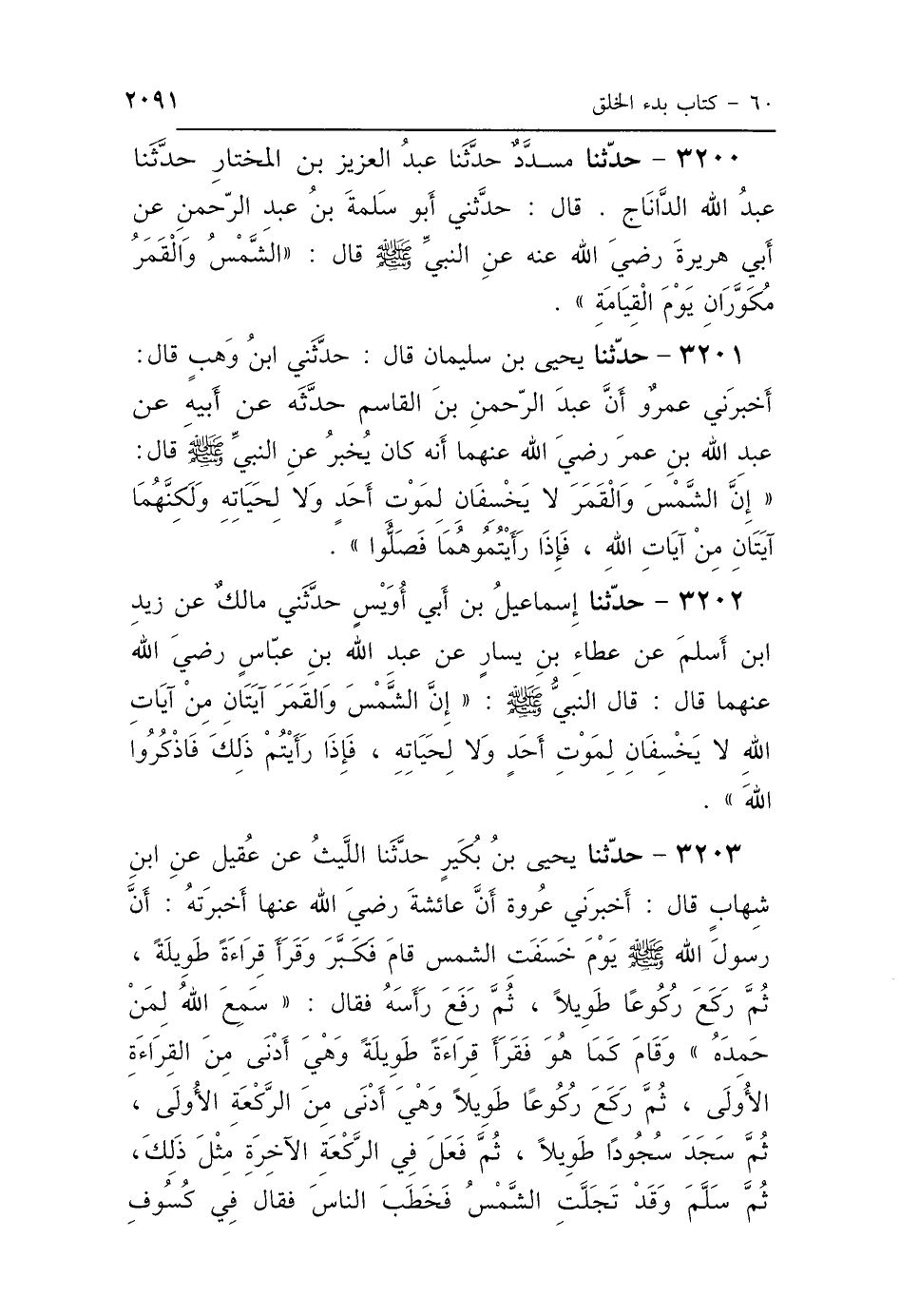 3201 - حَدَّثَنَا يَحْيَى بْنُ سُلَيْمَانَ، قَالَ: حَدَّثَنِي ابْنُ وَهْبٍ، قَالَ: أَخْبَرَنِي عَمْرٌو، أَنَّ عَبْدَ الرَّحْمَنِ بْنَ القَاسِمِ، حَدَّثَهُ عَنْ أَبِيهِ، عَنْ عَبْدِ اللَّهِ بْنِ عُمَرَ رَضِيَ اللَّهُ عَنْهُمَا أَنَّهُ كَانَ يُخْبِرُ، عَنِ النَّبِيِّ صَلَّى اللهُ عَلَيْهِ وَسَلَّمَ، قَالَ: «إِنَّ الشَّمْسَ وَالقَمَرَ لاَ يَخْسِفَانِ لِمَوْتِ أَحَدٍ وَلاَ لِحَيَاتِهِ، وَلَكِنَّهُمَا آيَتَانِ مِنْ آيَاتِ اللَّهِ، فَإِذَا رَأَيْتُمُوهُمَا فَصَلُّوا».