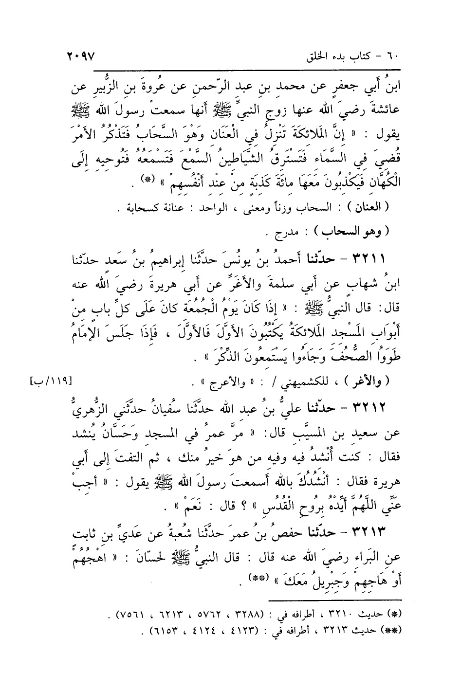 ابْنُ أَبِي جَعْفَرٍ، عَنْ مُحَمَّدِ بْنِ عَبْدِ الرَّحْمَنِ، عَنْ عُرْوَةَ بْنِ الزُّبَيْرِ، عَنْ عَائِشَةَ رَضِيَ اللَّهُ عَنْهَا، زَوْجِ النَّبِيِّ صَلَّى اللهُ عَلَيْهِ وَسَلَّمَ، أَنَّهَا سَمِعَتْ رَسُولَ اللَّهِ صَلَّى اللهُ عَلَيْهِ وَسَلَّمَ، يَقُولُ: " إِنَّ المَلاَئِكَةَ تَنْزِلُ فِي العَنَانِ: وَهُوَ السَّحَابُ، فَتَذْكُرُ الأَمْرَ قُضِيَ فِي السَّمَاءِ، فَتَسْتَرِقُ الشَّيَاطِينُ السَّمْعَ فَتَسْمَعُهُ، فَتُوحِيهِ إِلَى الكُهَّانِ، فَيَكْذِبُونَ مَعَهَا مِائَةَ كَذْبَةٍ مِنْ عِنْدِ أَنْفُسِهِمْ".